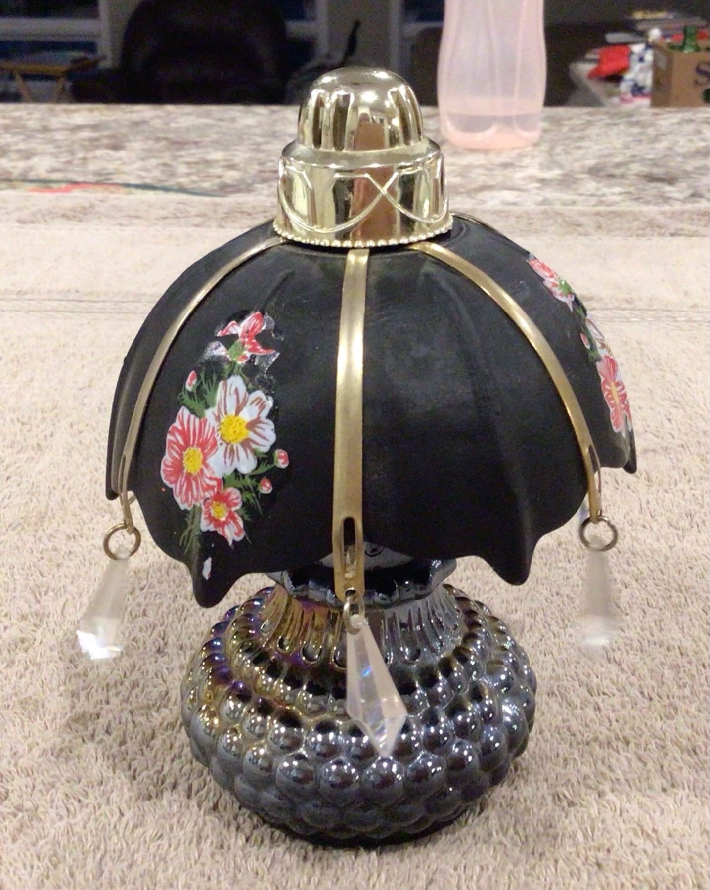 #1260 - Vintage iridescent black umbrella perfume bottle. Black glass umbrella with floral design. Black iridescent bottle.