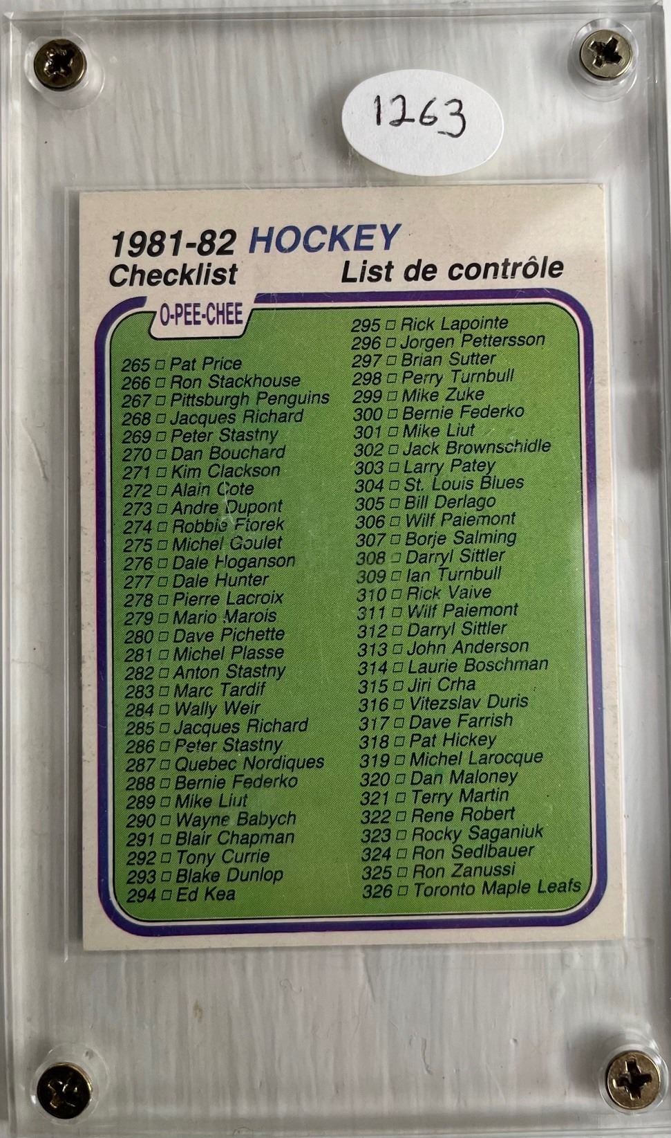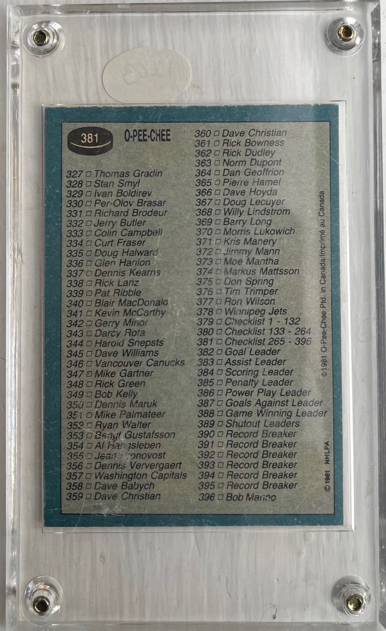 1263- 1981-83 O-Pee-Chee hockey card 381. Unmarked list in glass case. Near mint.