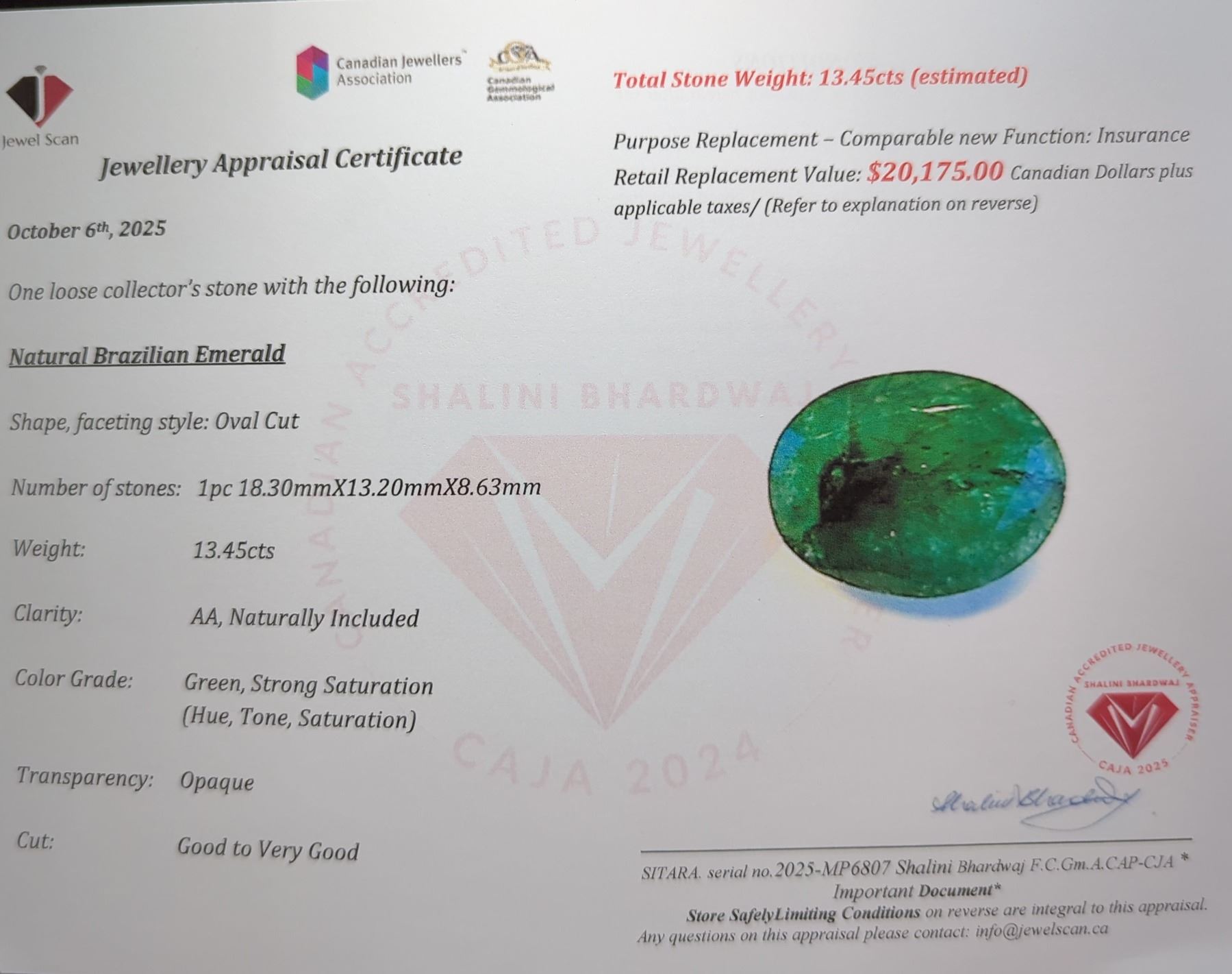 13.45 ct Certified Brazilian Emerald gemstone ($20,175 Appraisal)