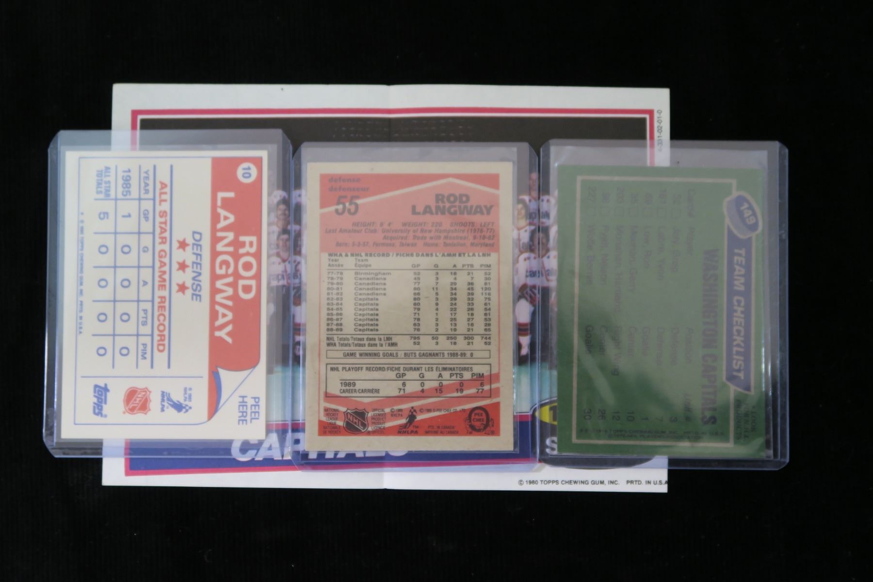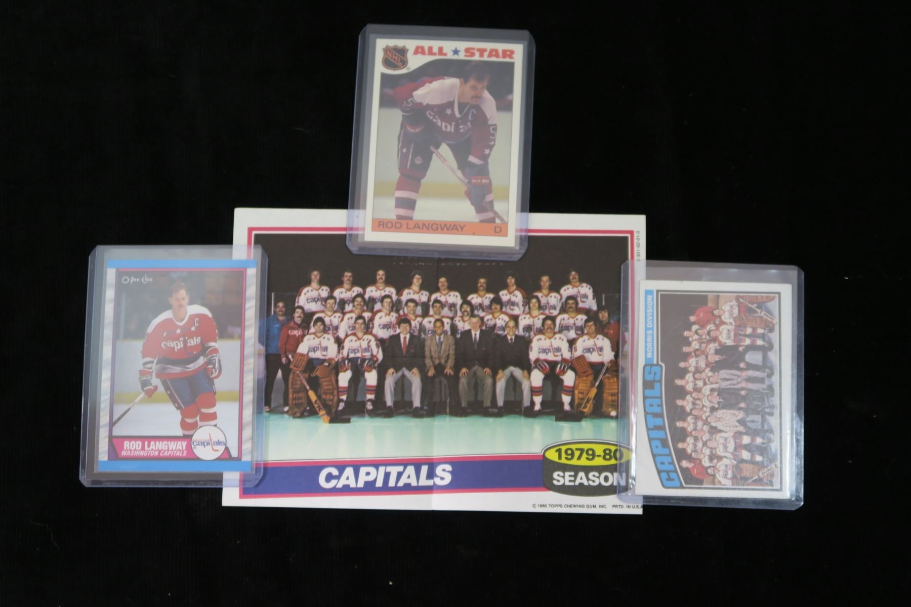 #1302 - Washington Capitals Lot; 2 Rod Langway Cards, 1976-77 Team Checklist Unmarked & Rare 1980-81 Topps Team Poster