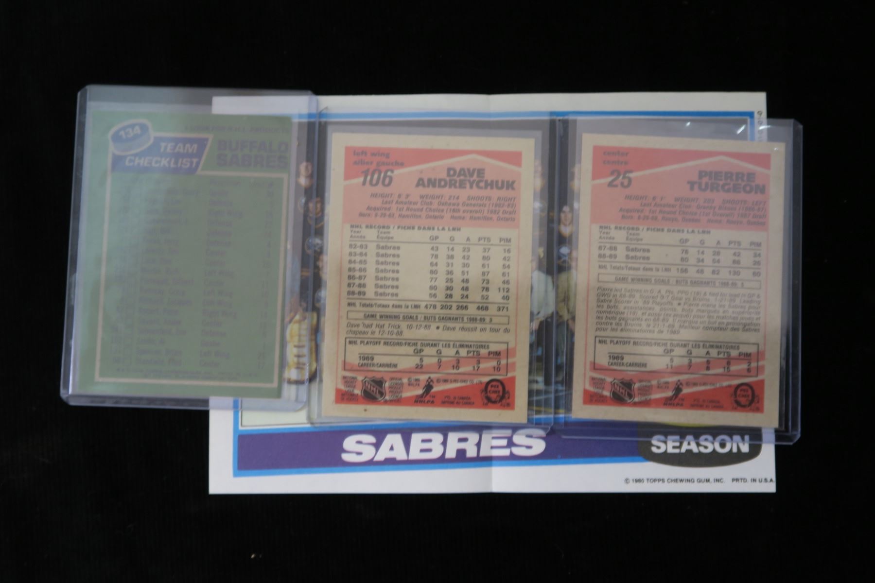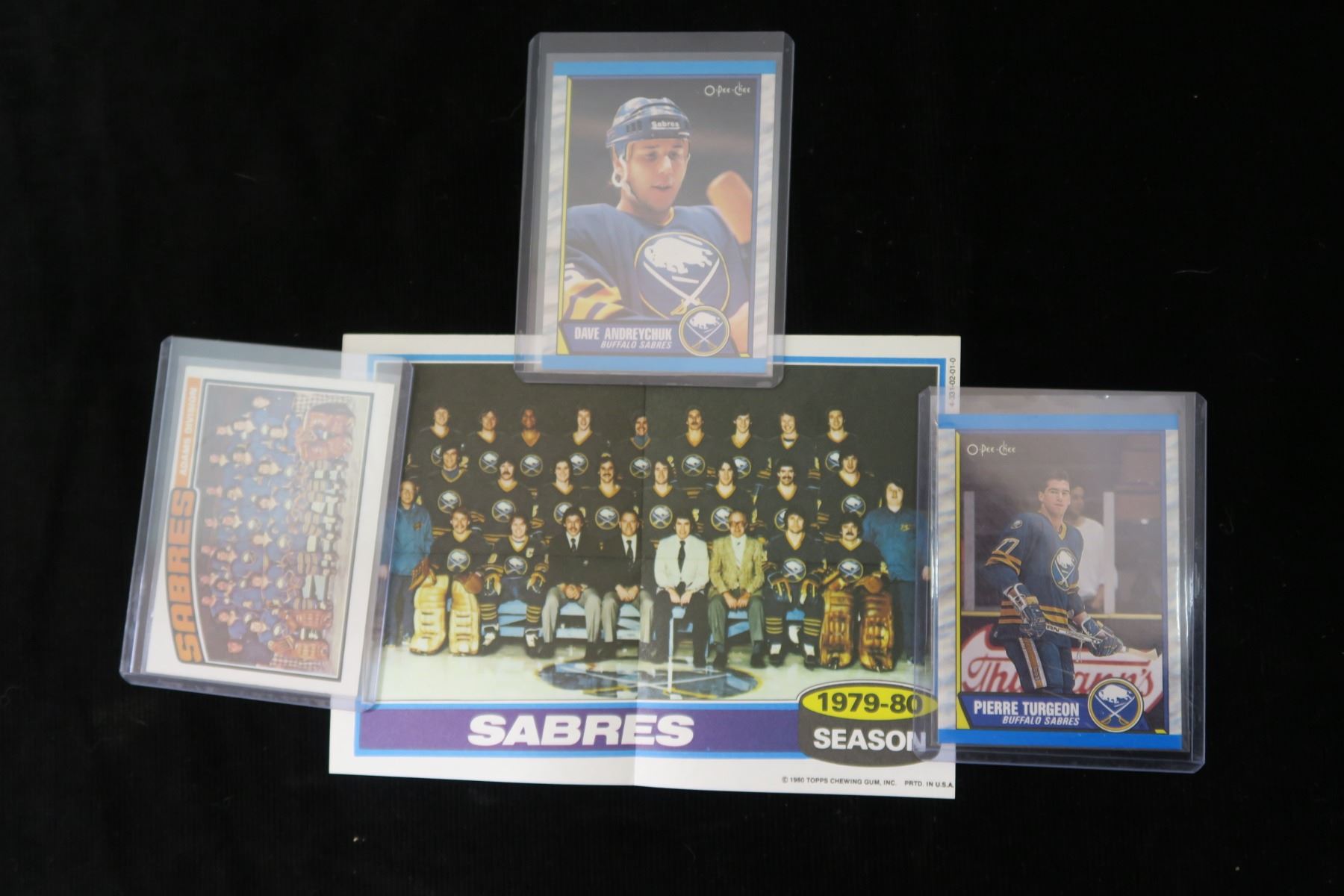 #1304 - Buffalo Sabres Lot; 1989-90 O-Pee-Chee Pierre Turgeon & Dave Andreychuk, 1976-77 Team Checklist Unmarked & Rare 1980-81 Topps Team Poster