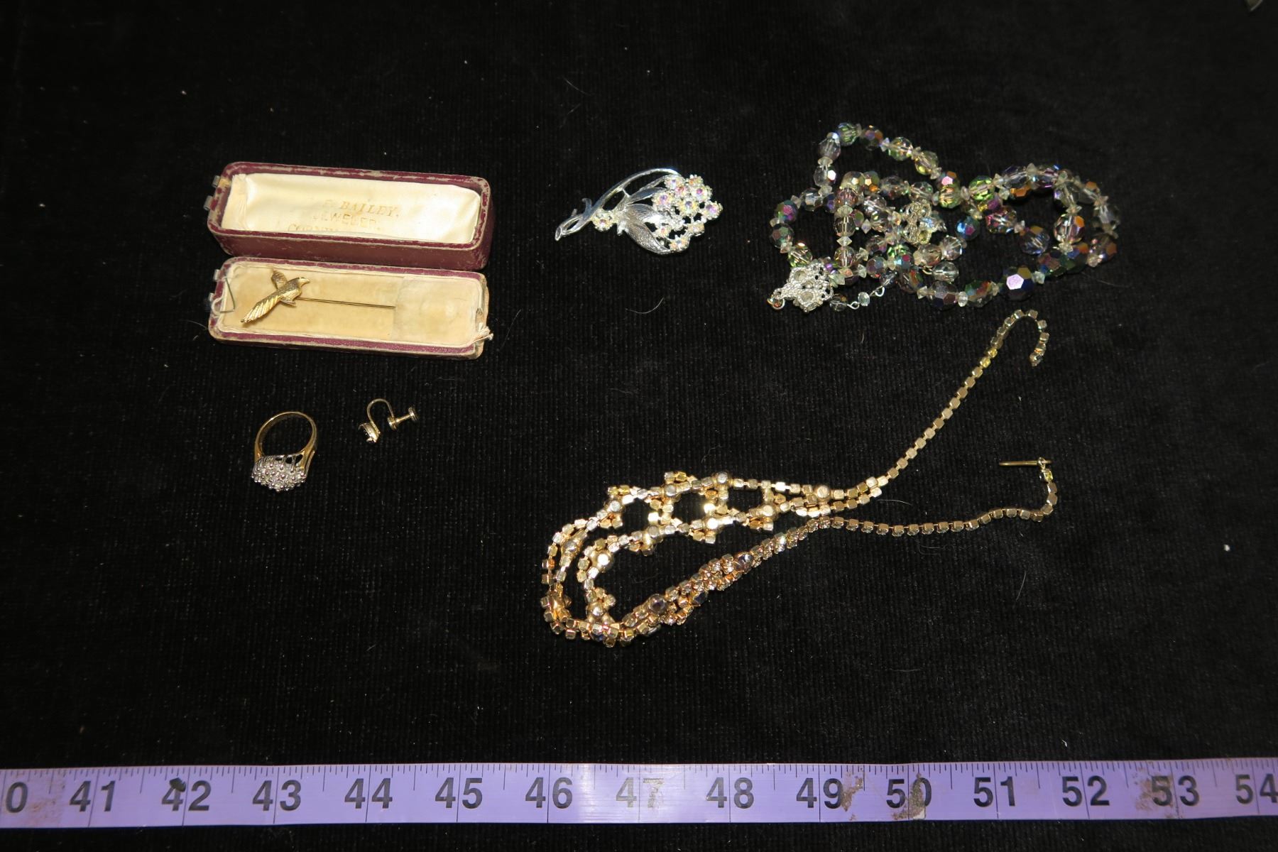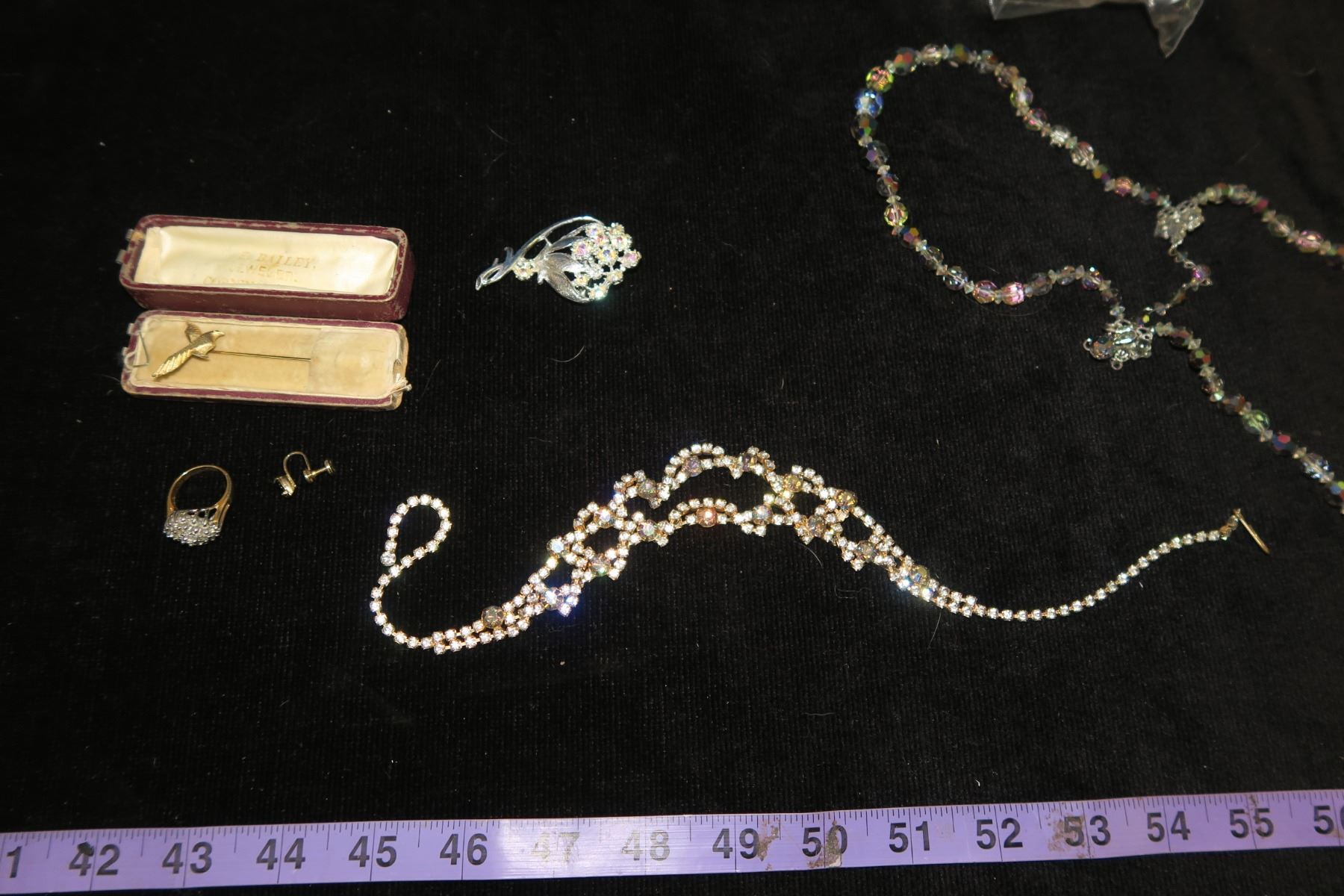 #1317 - Estate Costume Jewelry - 2 Continental Aurora Borealis Crystal Necklaces, ring & 2 pins