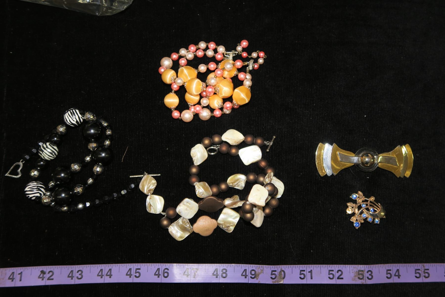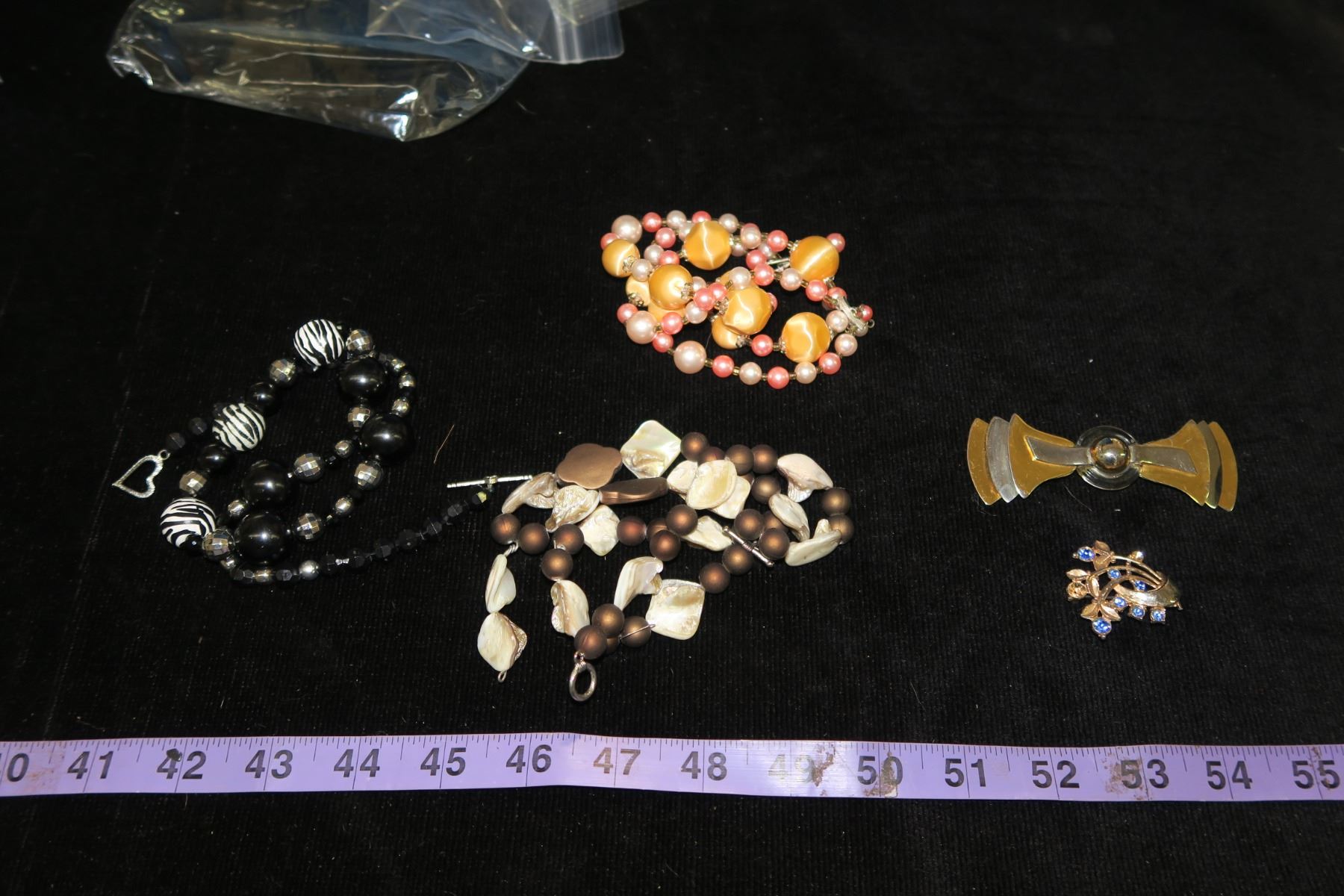 #1320 - Estate Costume Jewelry - Brushed Copper & faux abalone shell necklace, Black Zebra Strip beaded necklace, champagne faux pearl necklace, and two pins