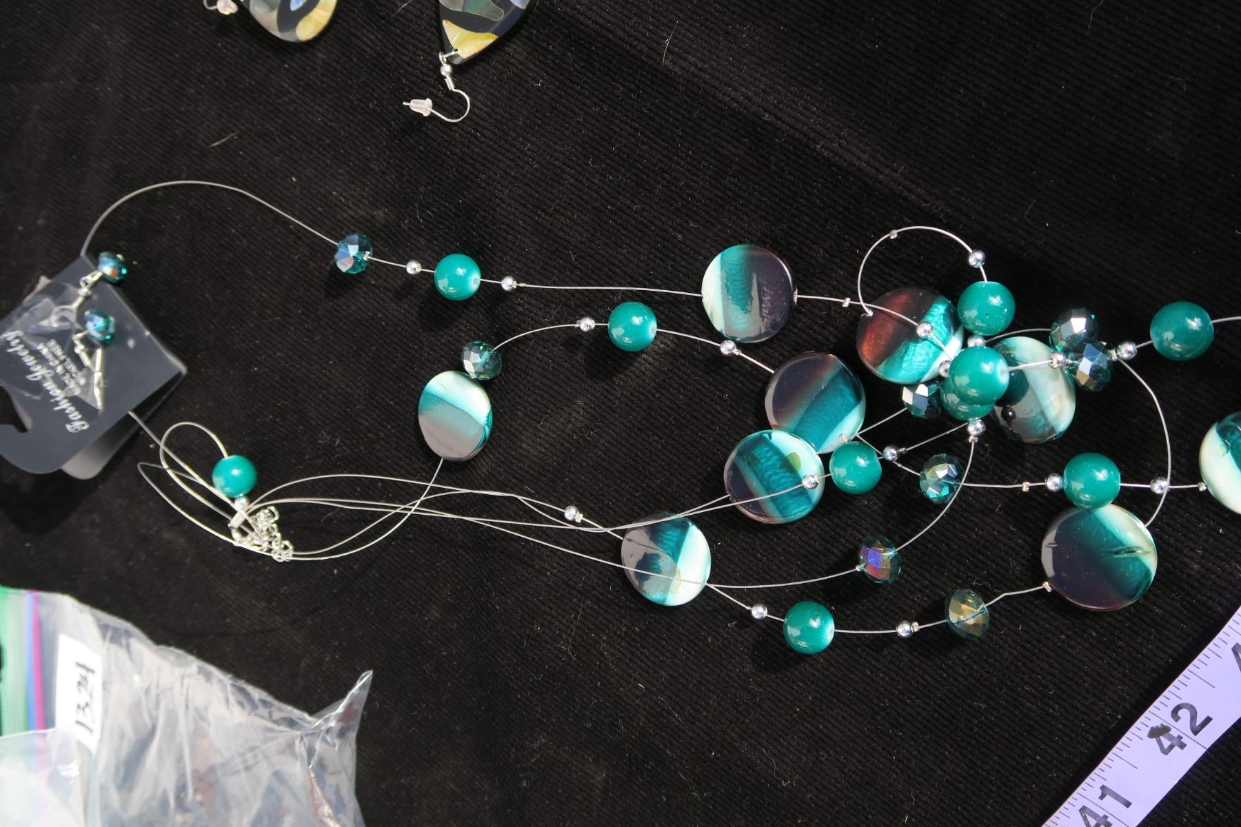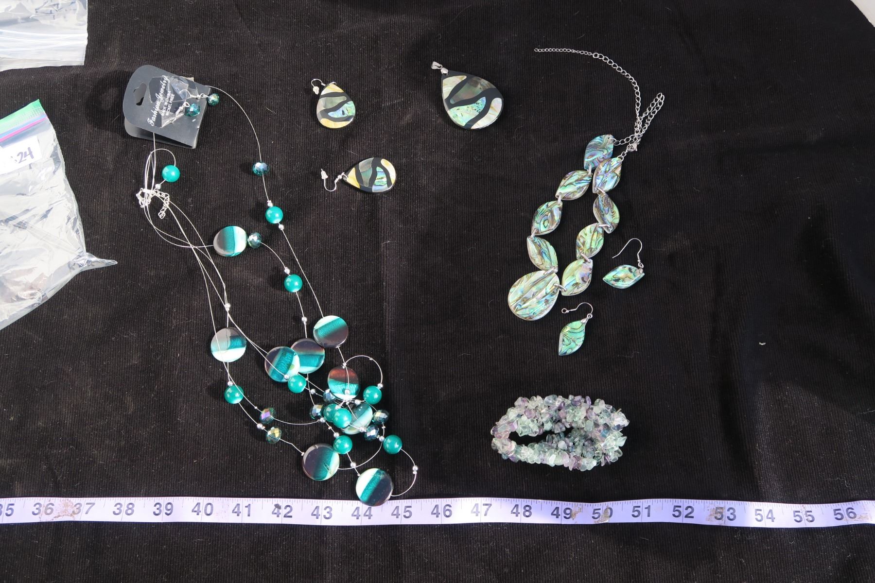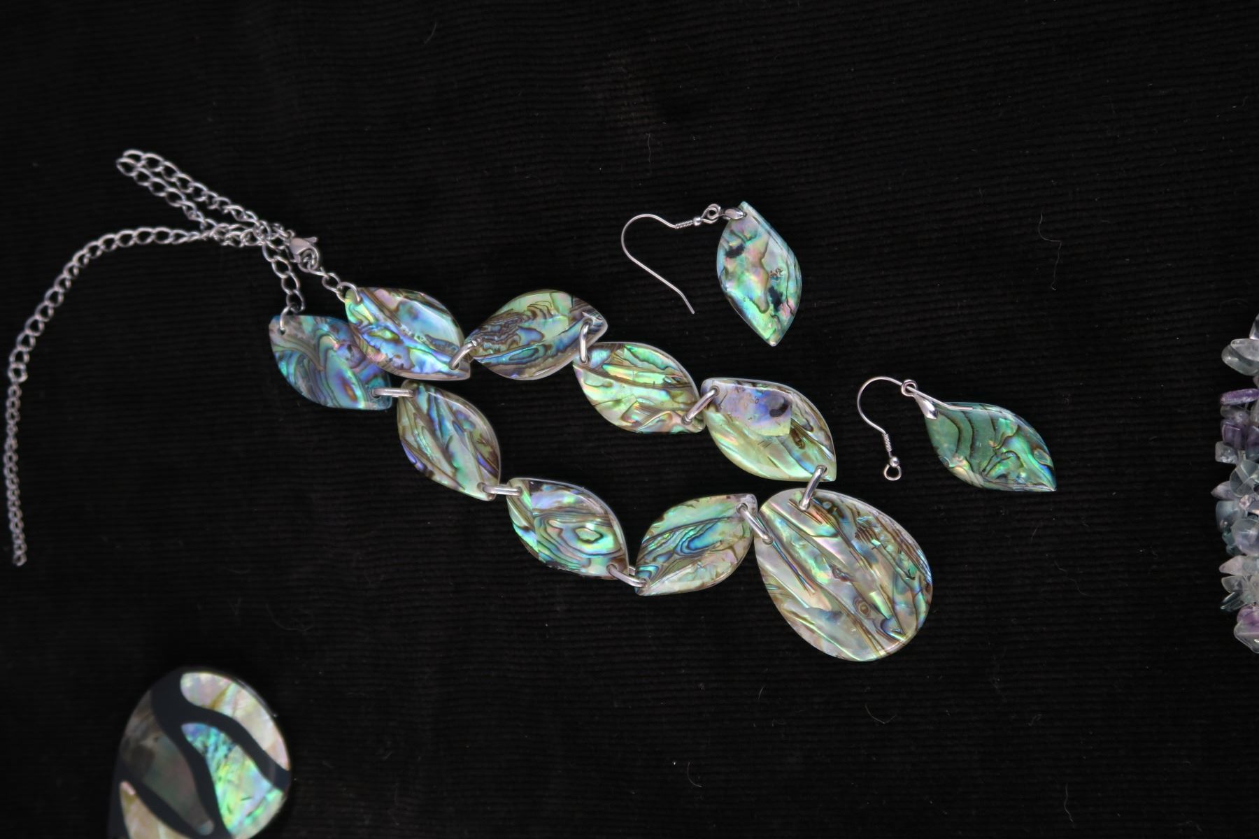 #1324 - Estate Costume Jewelry - Black & Green Beaded Necklace w/matching earrings, black teardrop inlaid mother of pearl earrings and amulet set, polished stone bracelet, faux abalone shell necklace and earrings