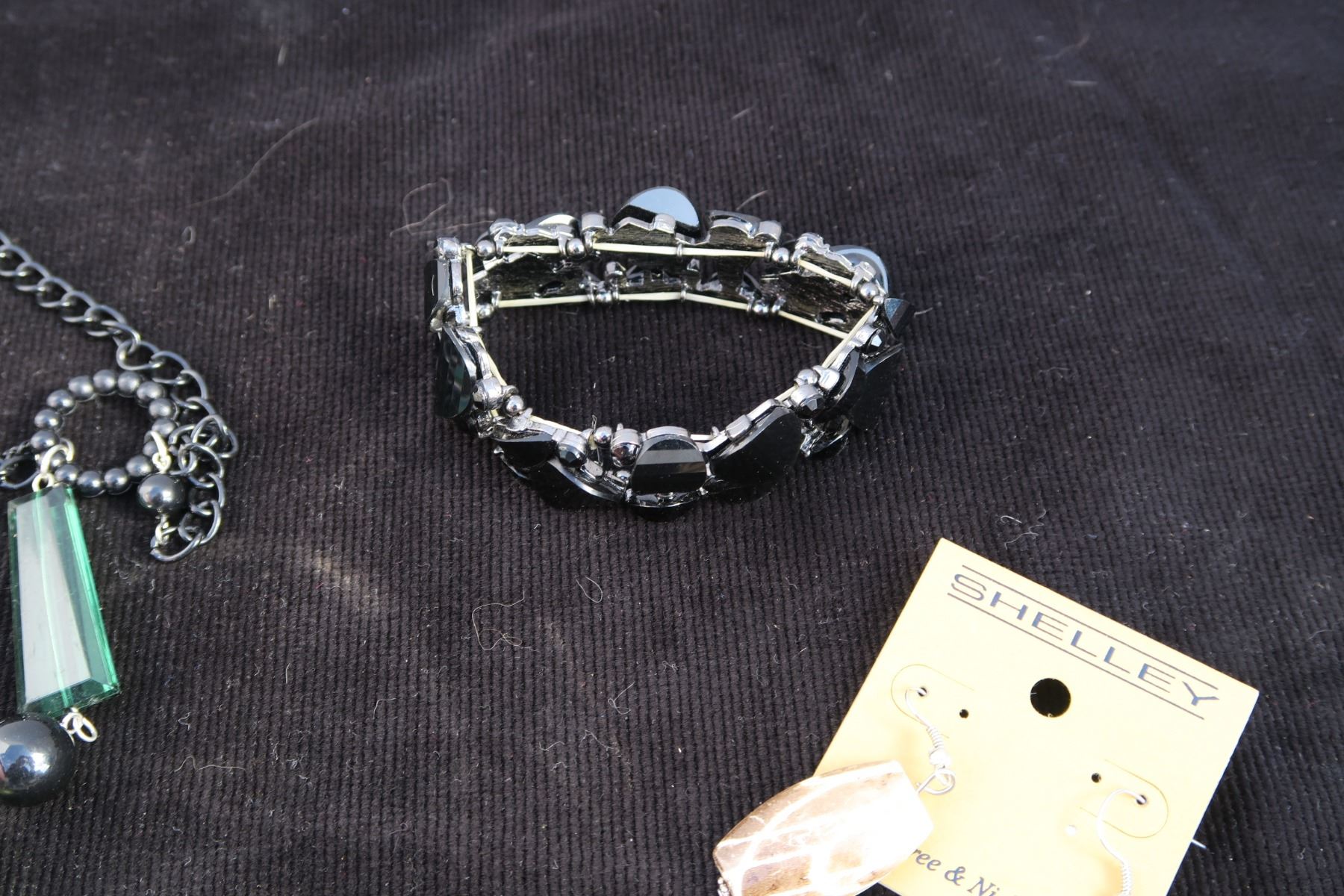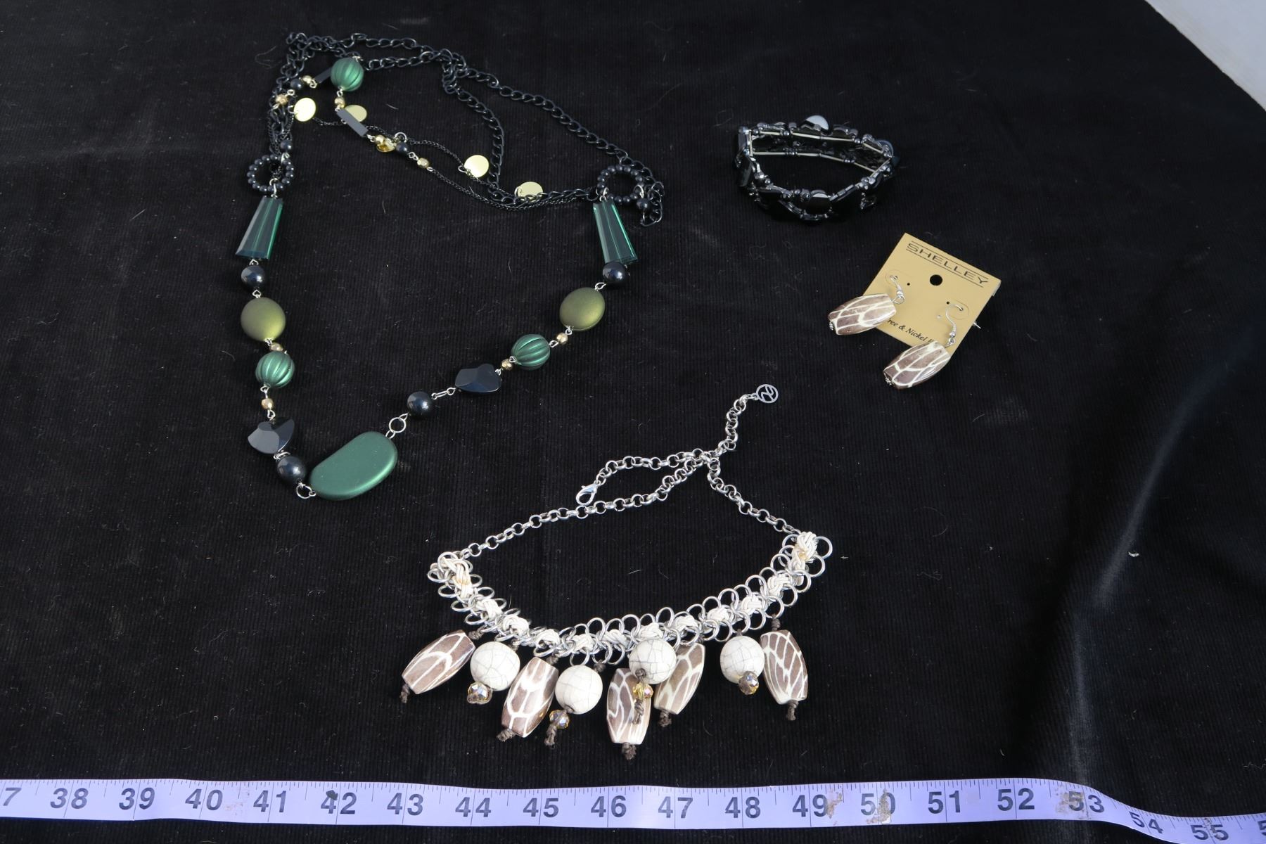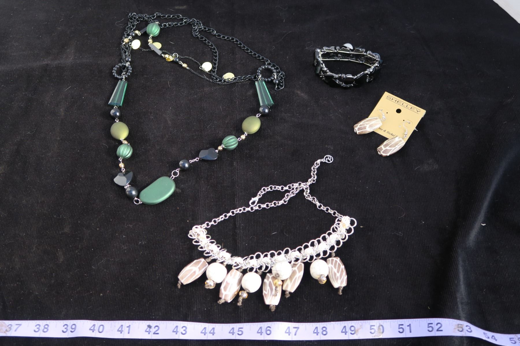 #1326 - Estate Costume Jewelry - Black Bracelet, Green & Black Beaded Necklace, Tan Bead silver necklace with matching earrings.