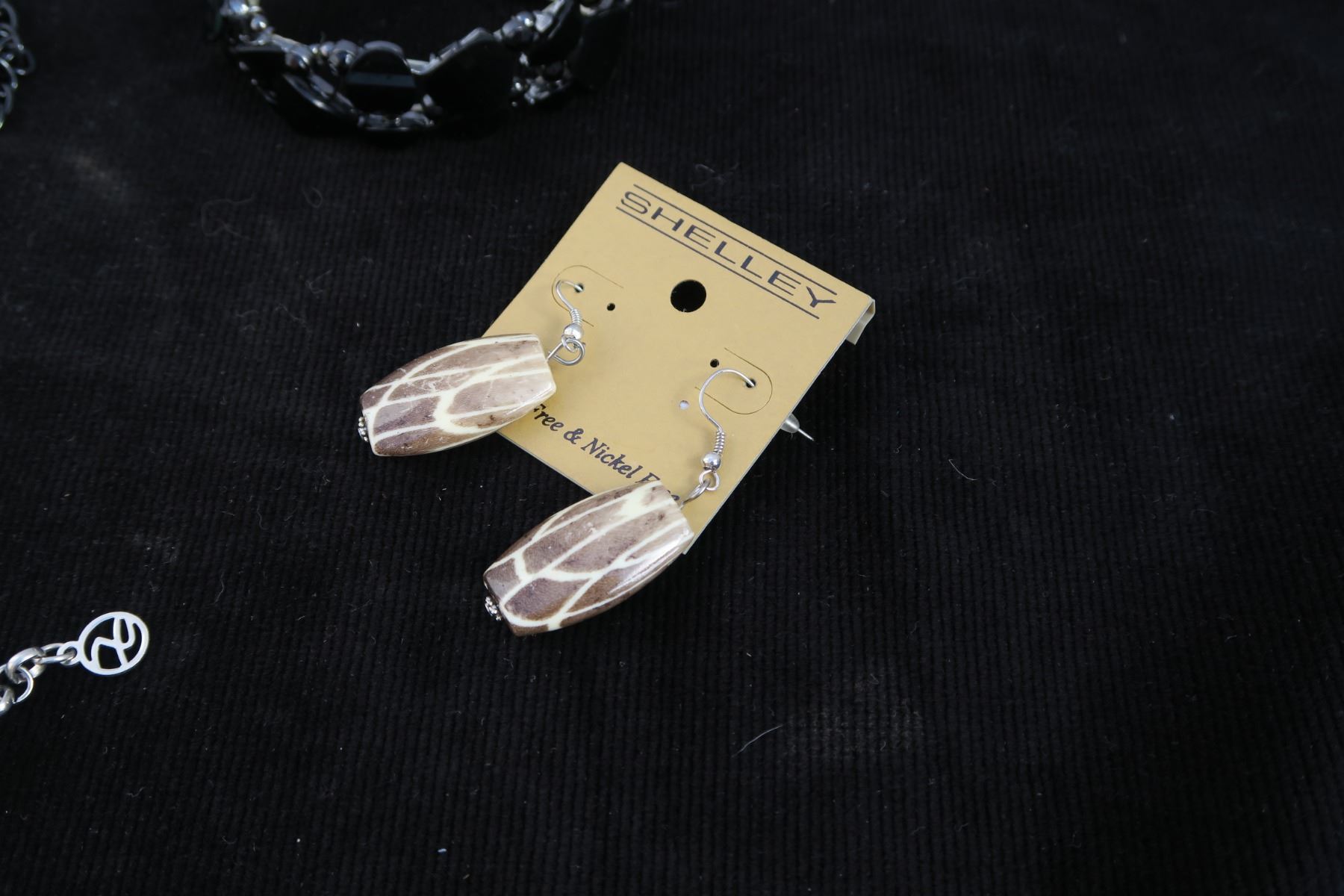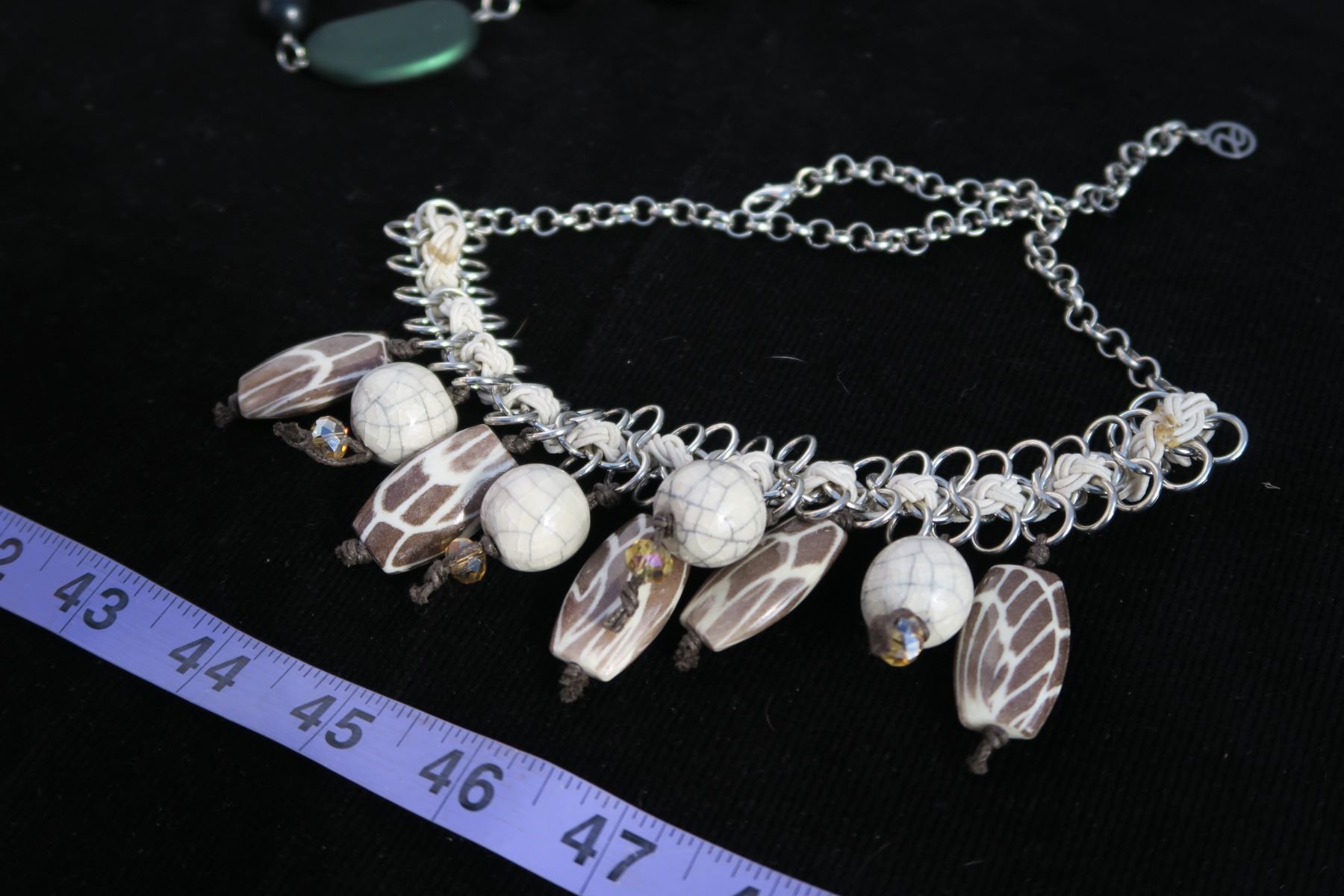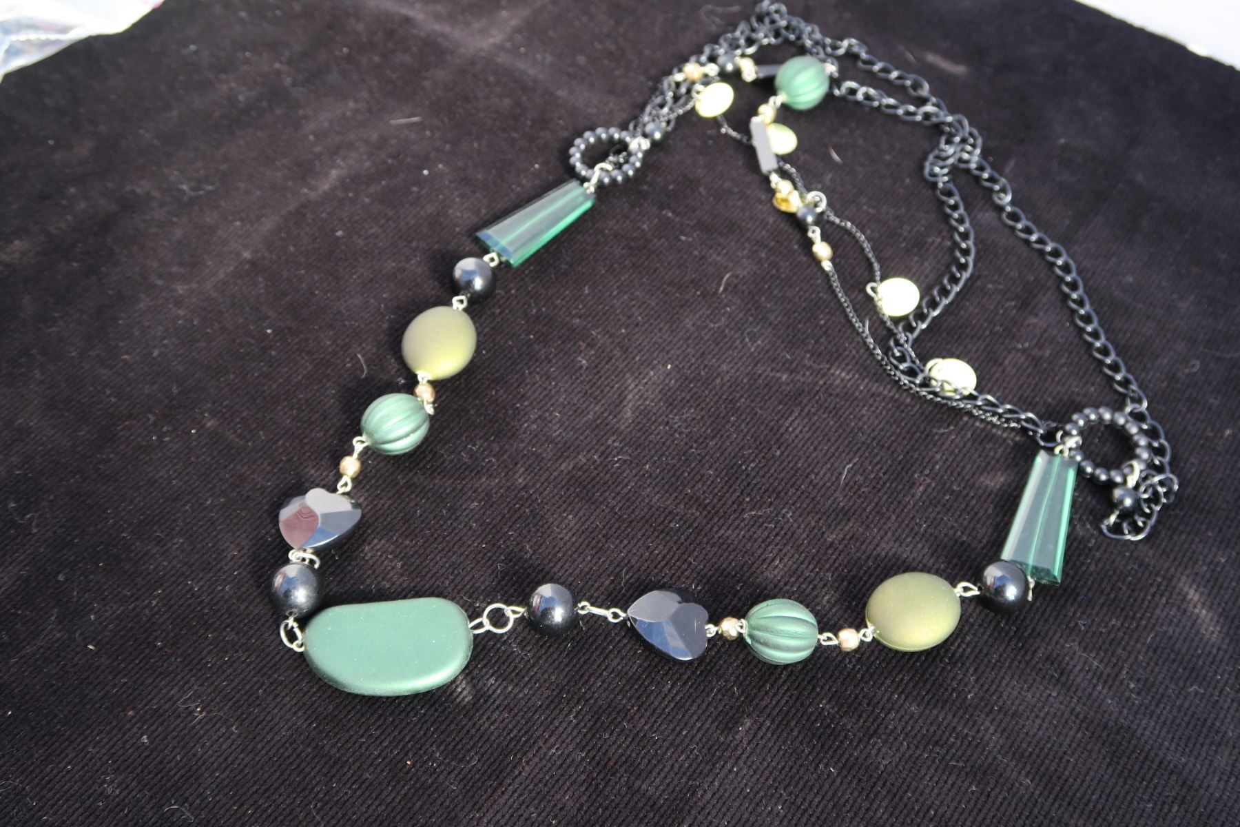 #1326 - Estate Costume Jewelry - Black Bracelet, Green & Black Beaded Necklace, Tan Bead silver necklace with matching earrings.