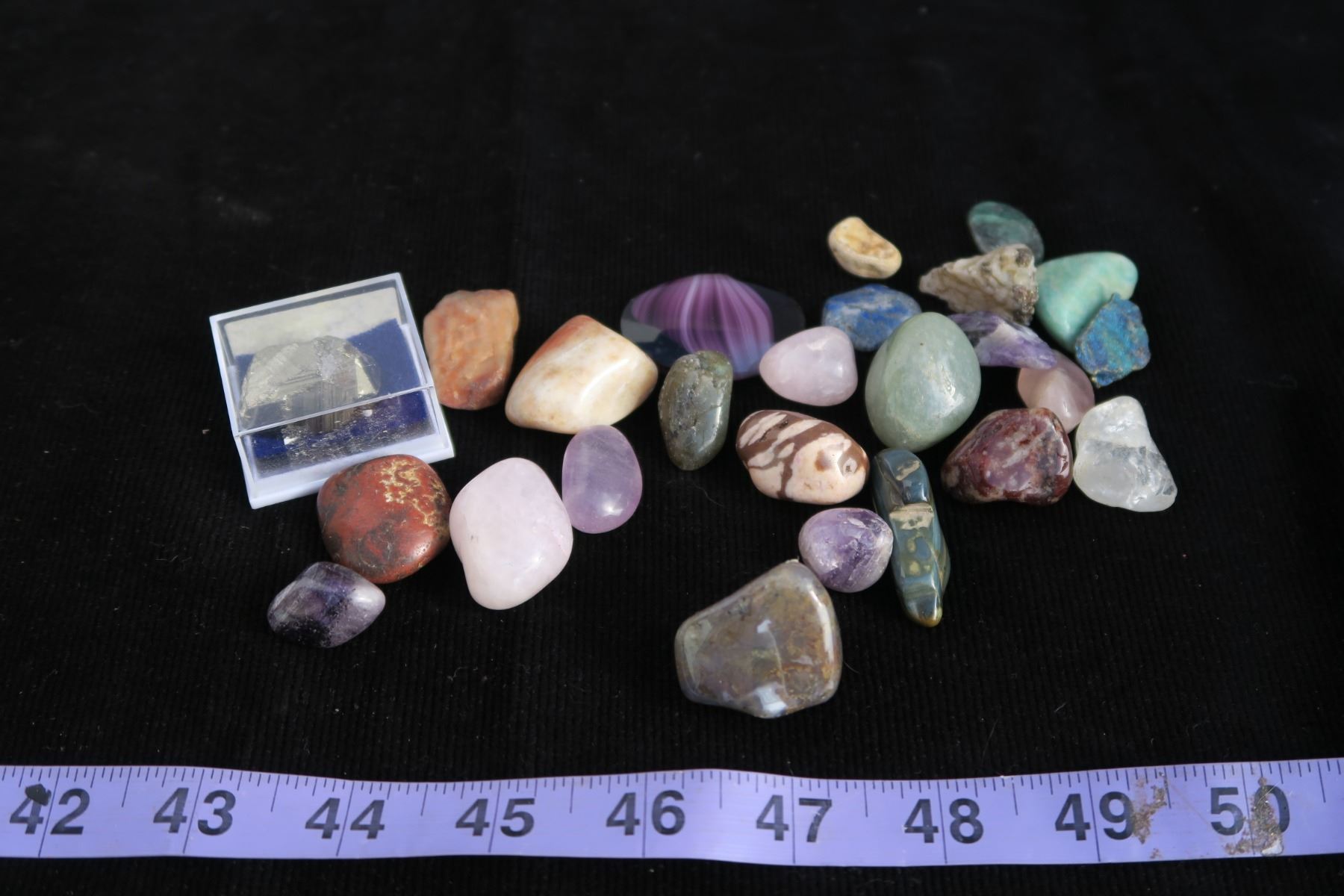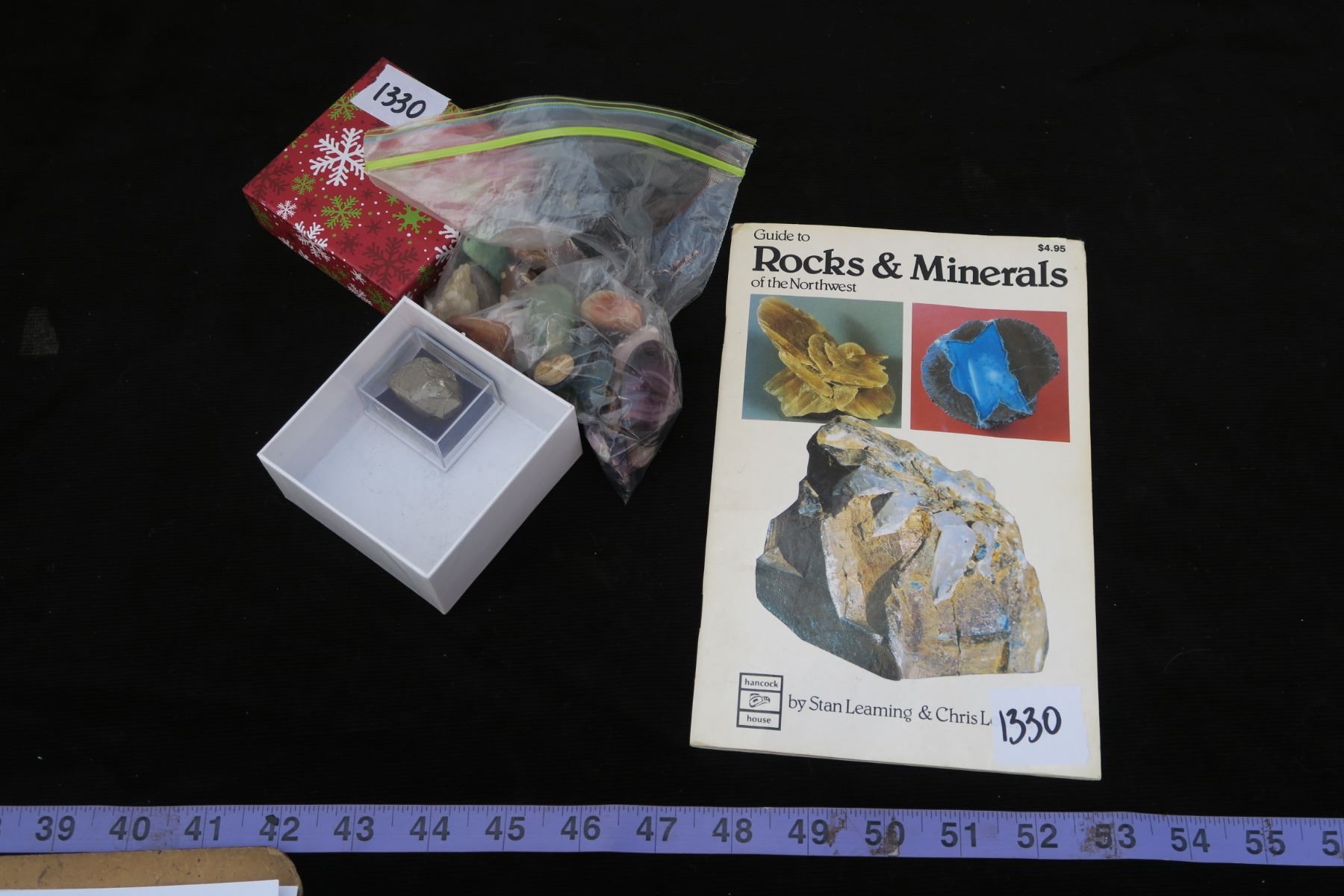 #1330 - Box of polished stones and specimen piece of Pyrite, Rock and Gem Book