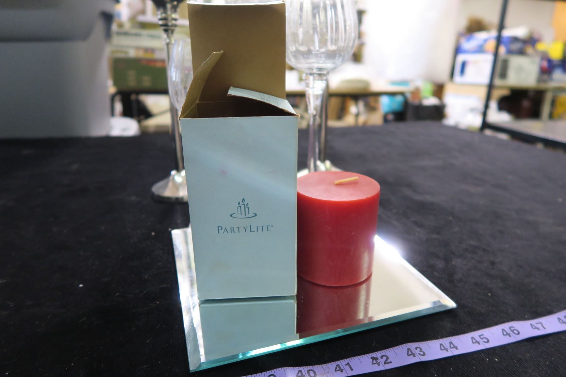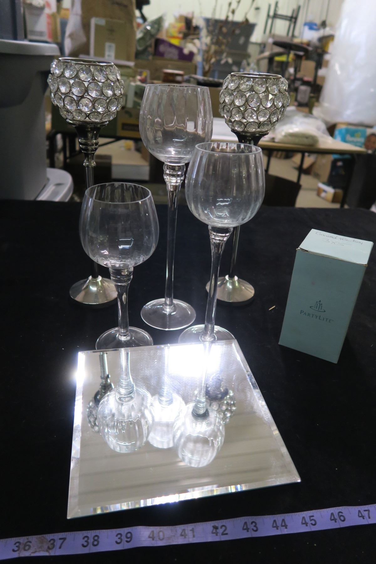 #1345 - Tiered Wineglass Trio Votive Holders, pair of Tealight Holders & Mirror Candle Tray and a Cinnamon Bayberry 3X5 Pillar