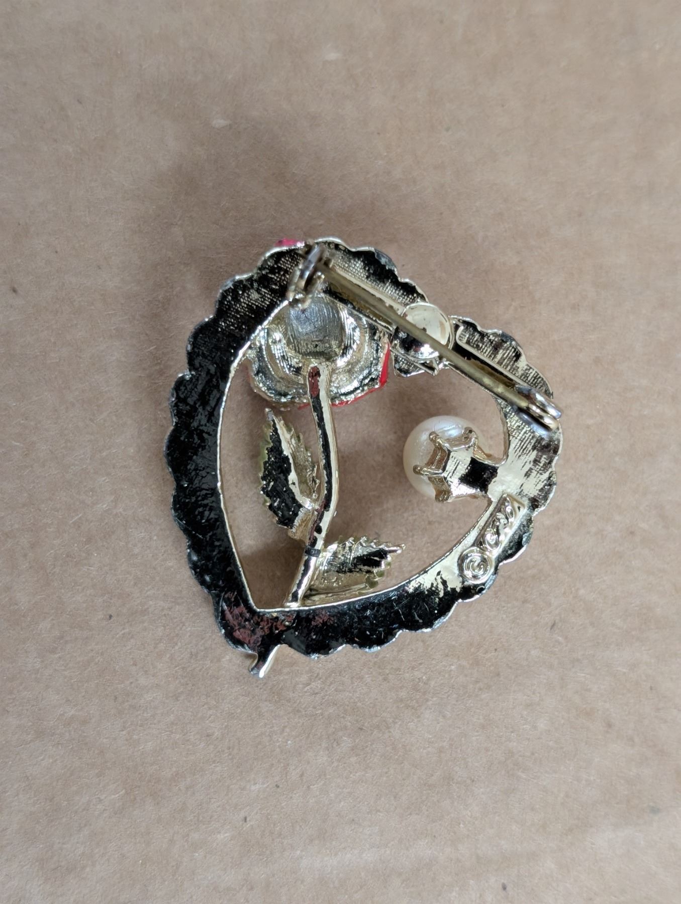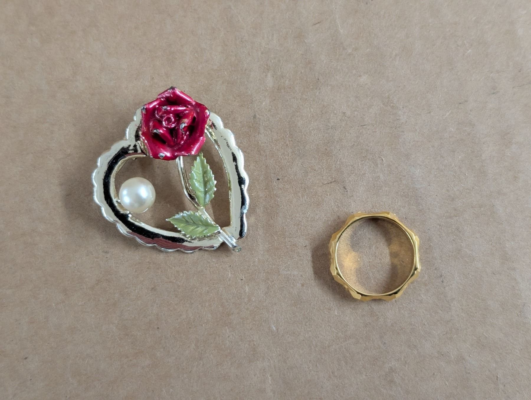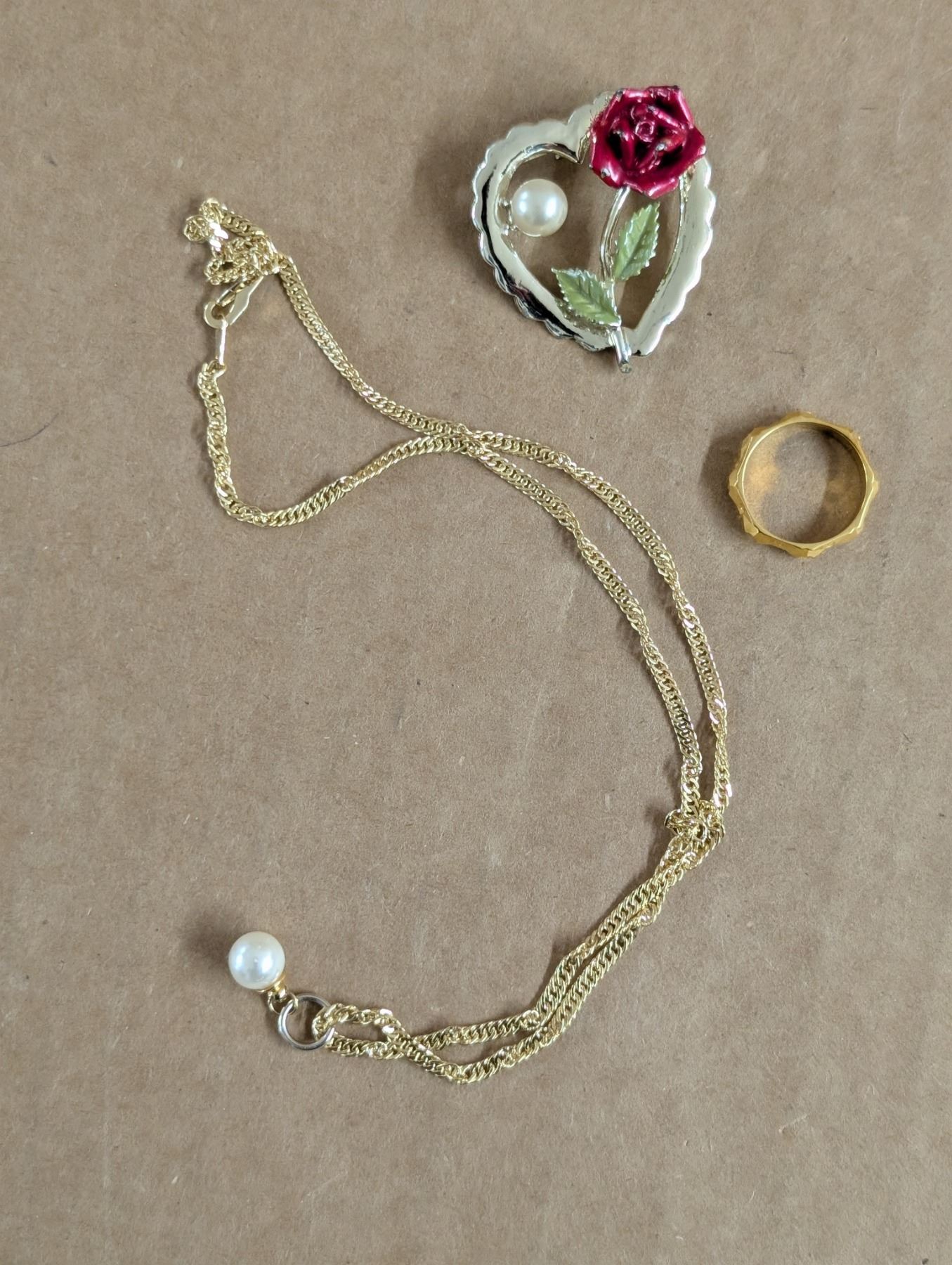 14KT G.P, Necklace (Unverified) W/ Ring and Rose/Pearl Heart Pendant