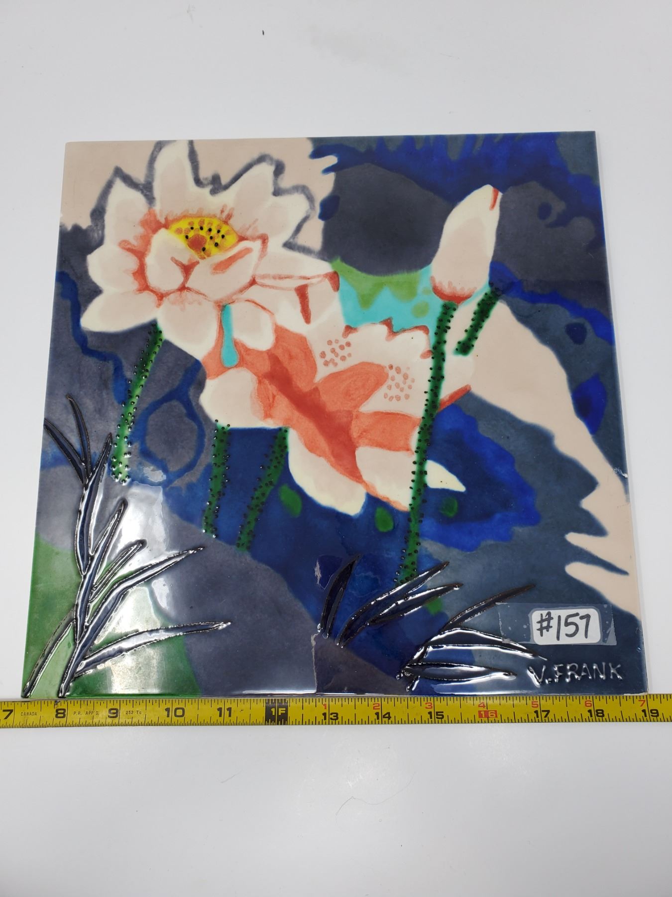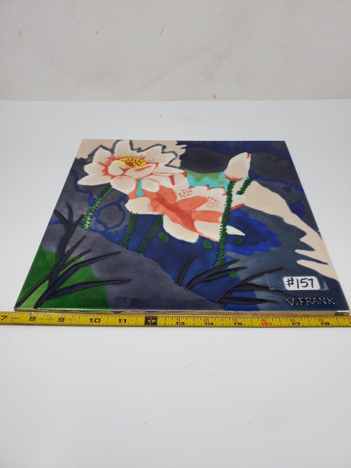 157. Floral ceramic tile, by V. Frank, 12” x 12”