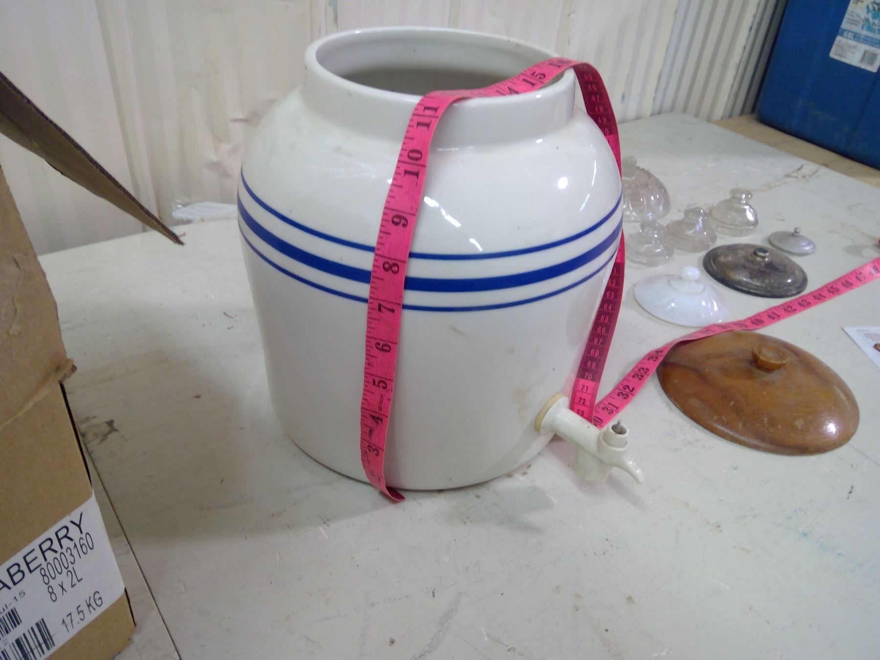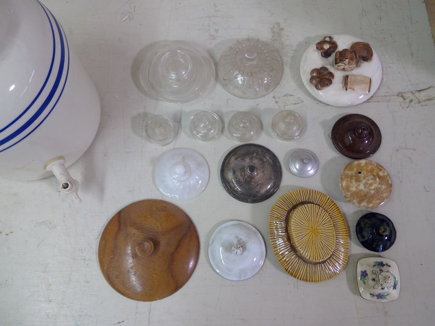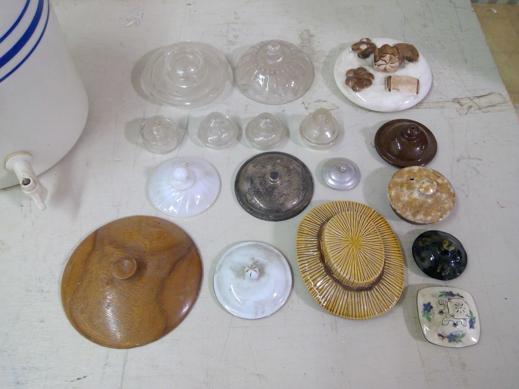 17 MISC. LIDS (NO MATCHING CONTAINERS) AND ONE LARGE JUG