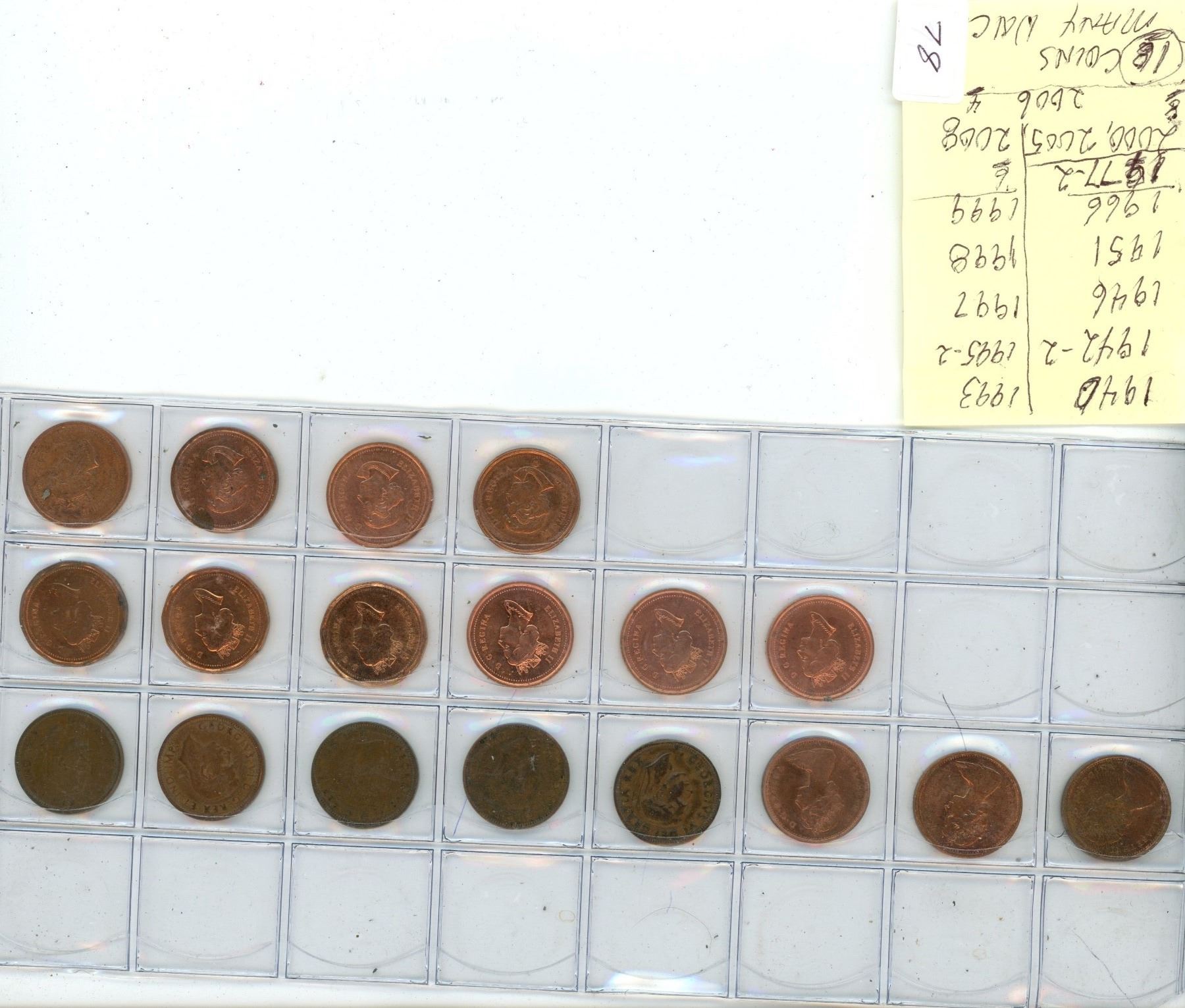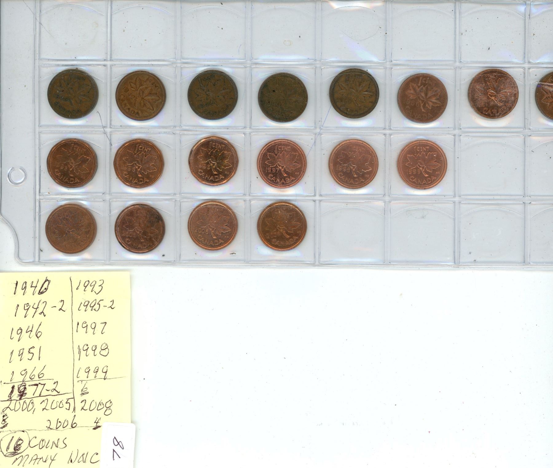 18 Canadian 1C Coins 1940, 2 X 1940, 46, 1951, 66, 2 X 77, 1993, @x 1995, 97, 98, 99, 2000, 2005, 2006, 2008