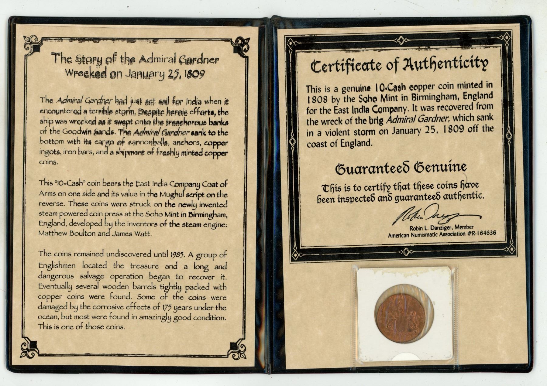 1808 East India Company 10 Cash coin recovered from the Wreck of the Admiral Gardner, which sank on January 25, 1809 off the coast of England.