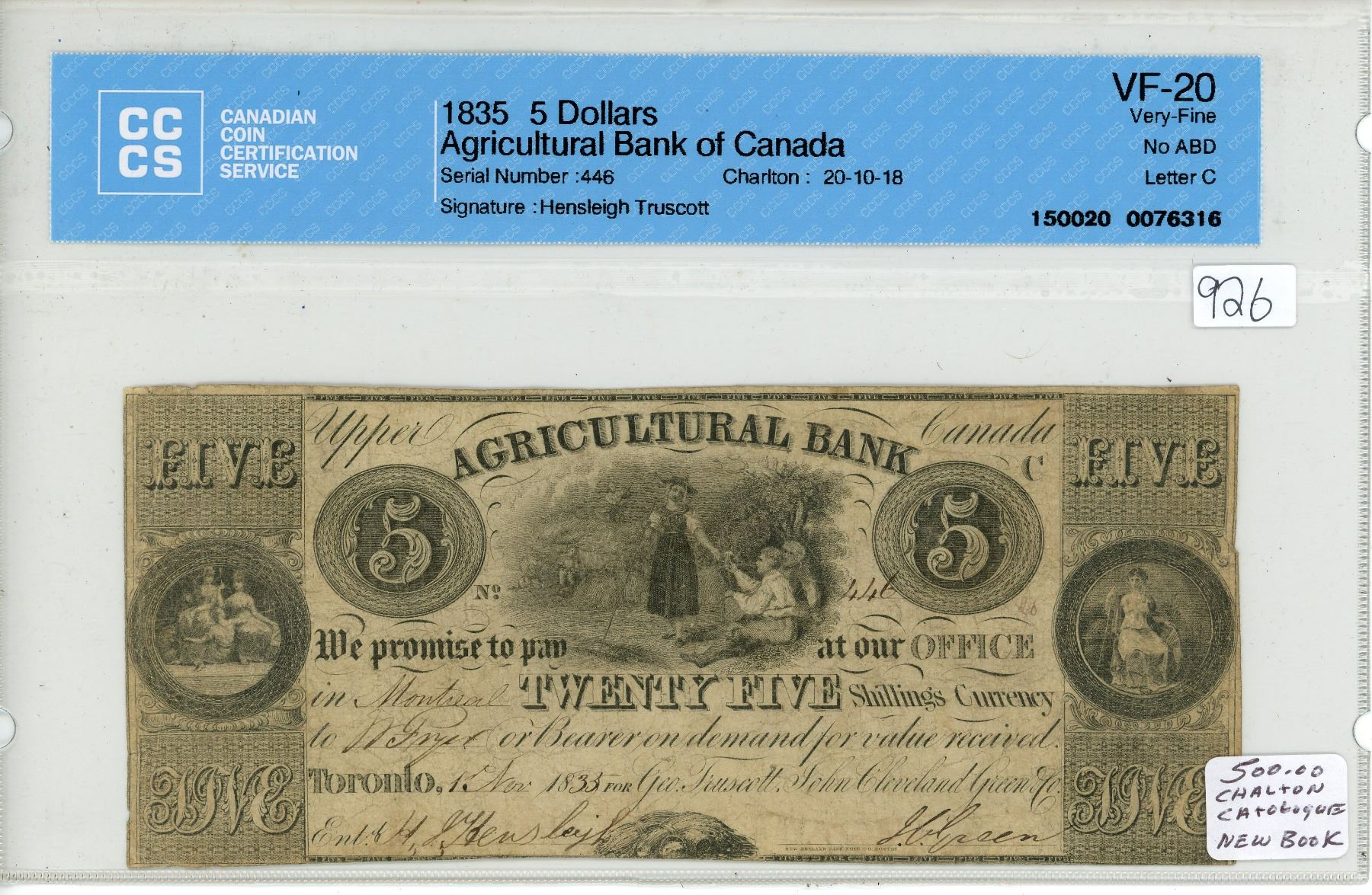 1835 Agricultural Bank of Canada $5.00 note - CCCS VF-20 serial no.446