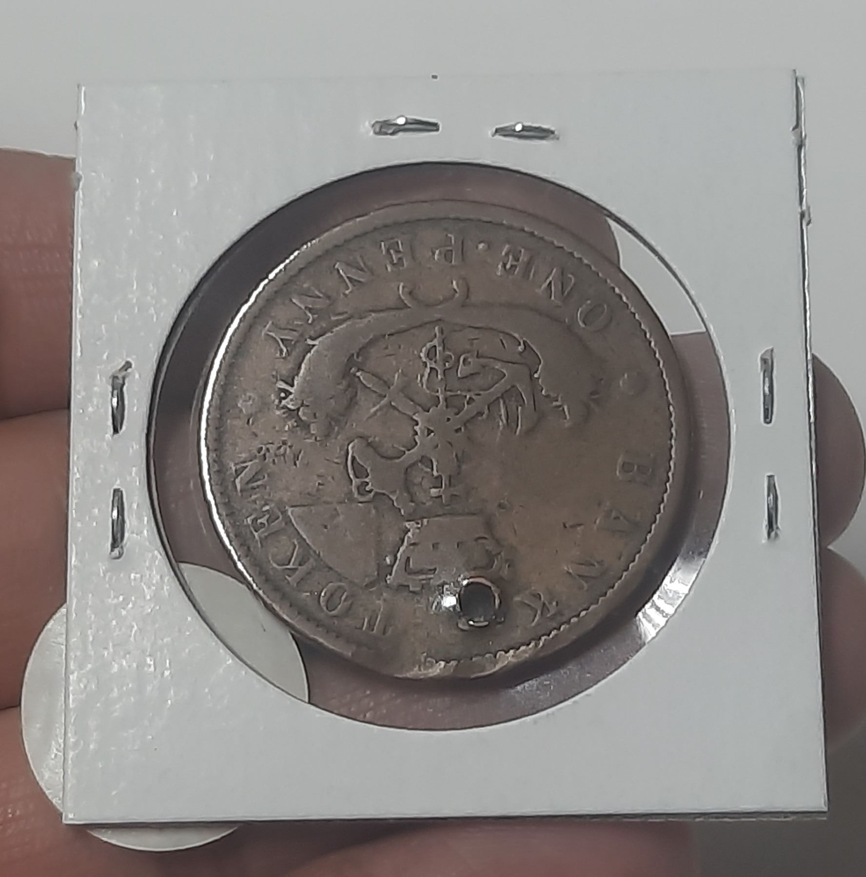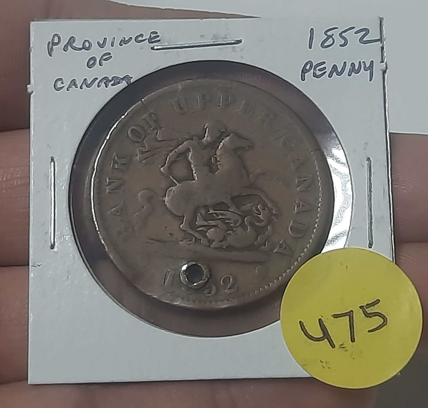 1852 Province of Canada Bank of Upper Canada One Penny Token. St. George slaying dragon. Good. Holed.