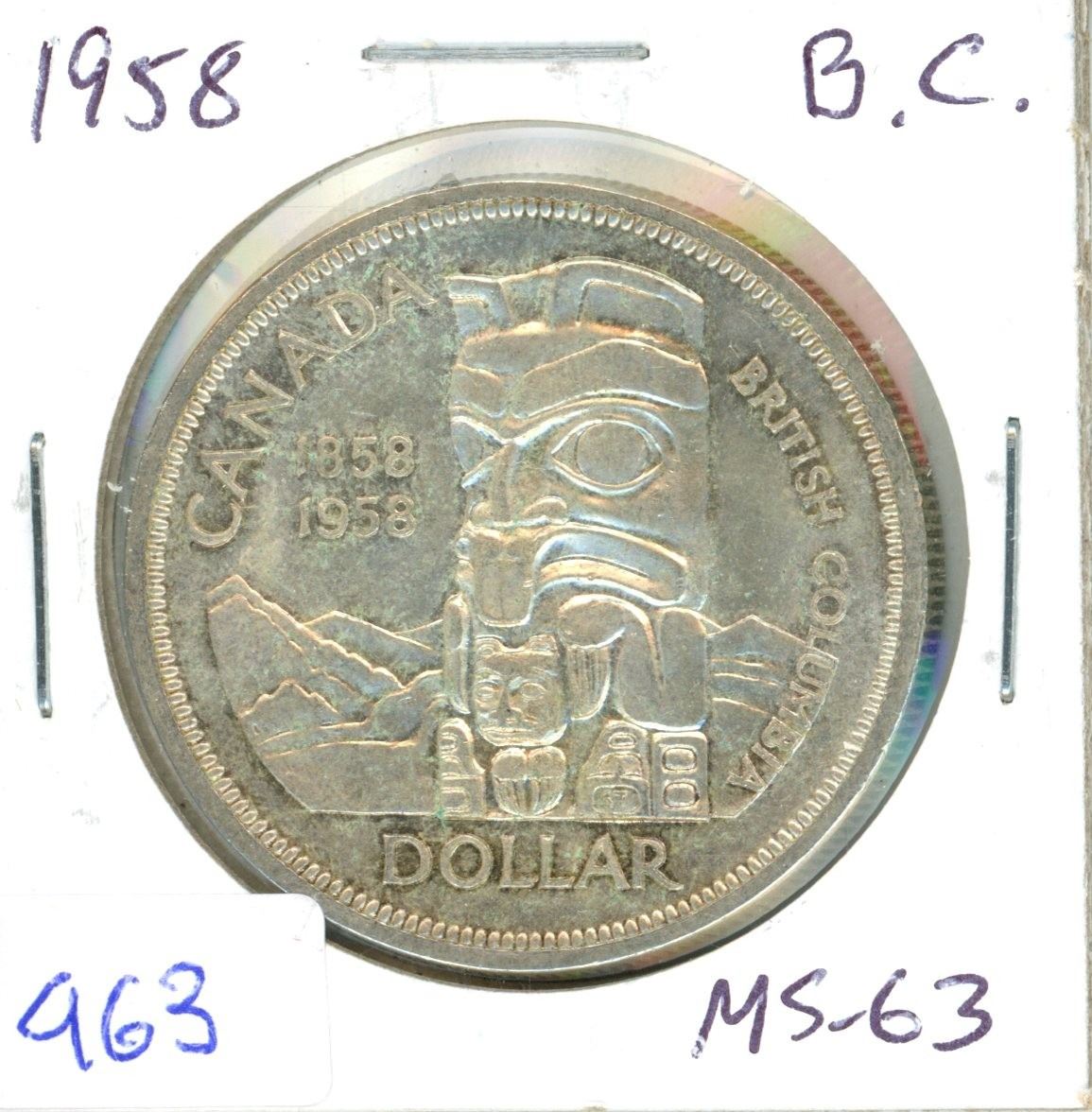 1858 – 1958 Canadian Silver Dollar. 100th Anniversary of British Columbia becoming a Crown Colony. Popular Totem Pole. MS-63.