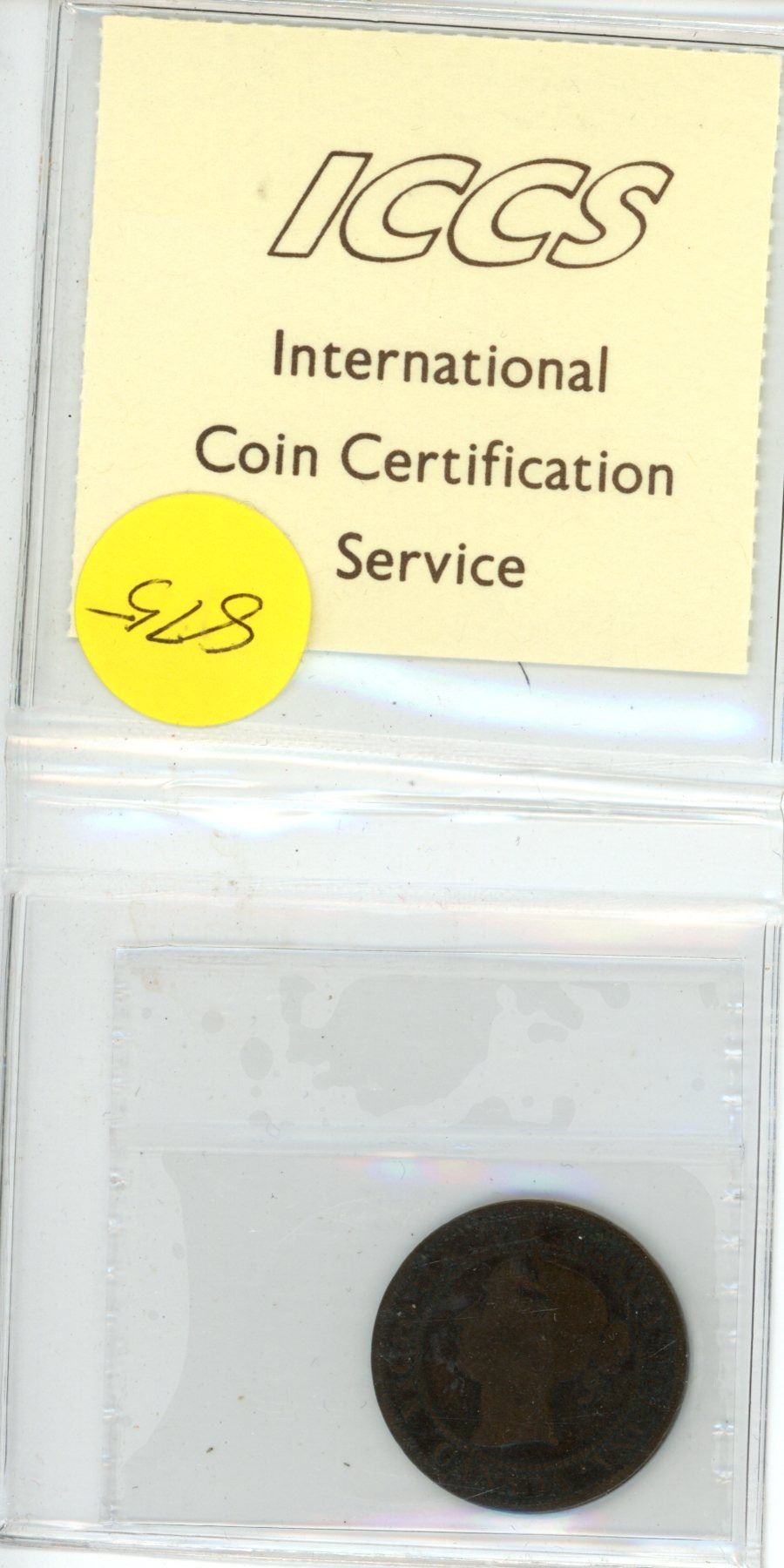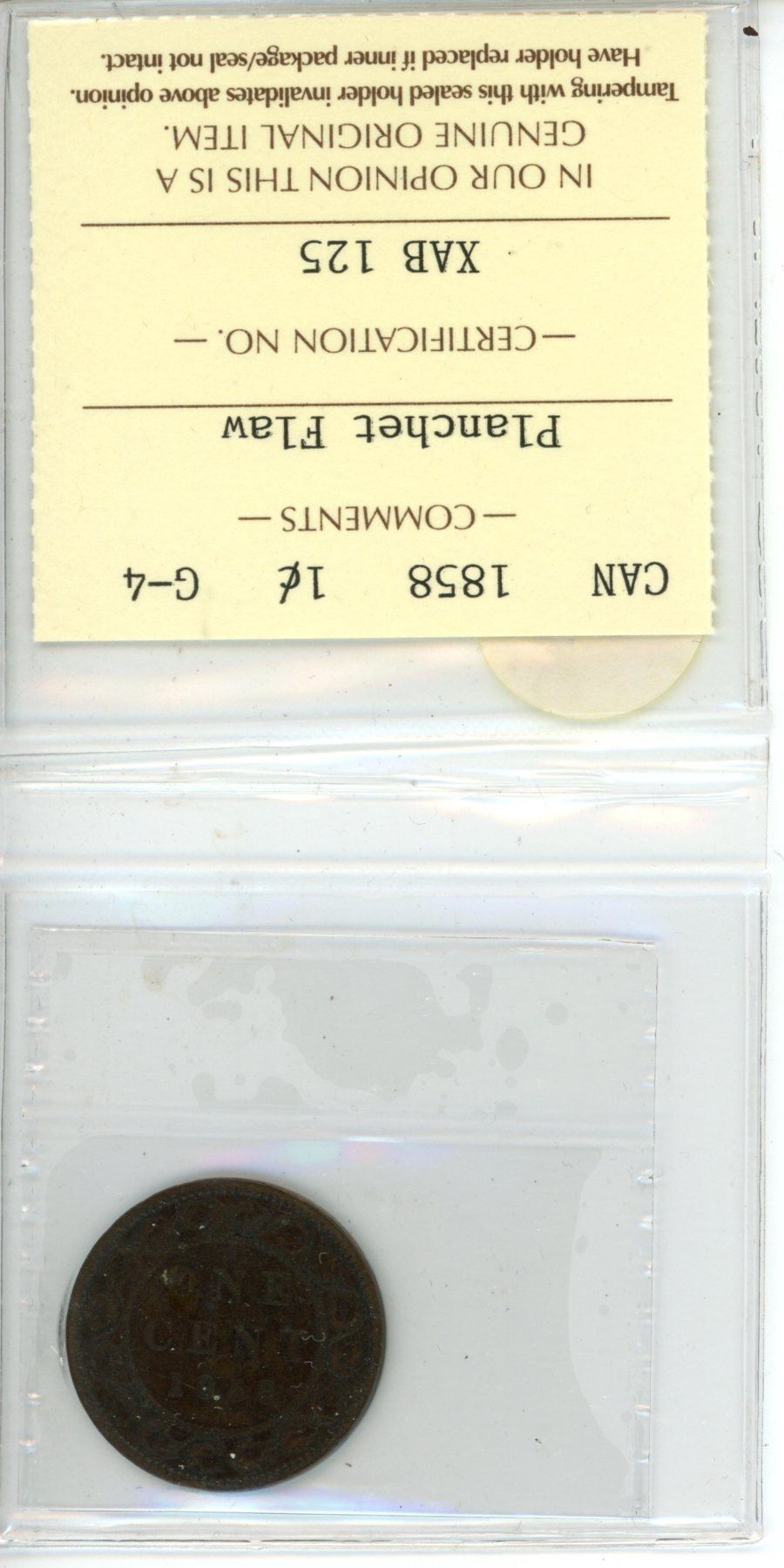 1858 Canadian Victorian Large Cent. The Province of Canada’s first Large Cent. Key Date. ICCS certified and graded G-4 Planchet Flaw.