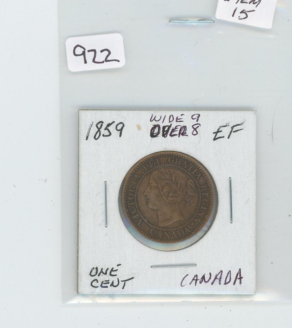 1859 WIDE 9 OVER 8 ONE CENT (EF)