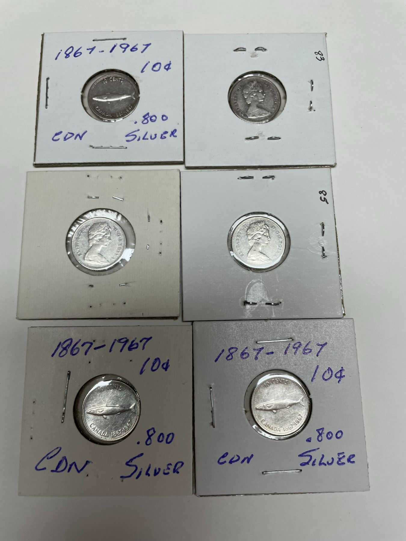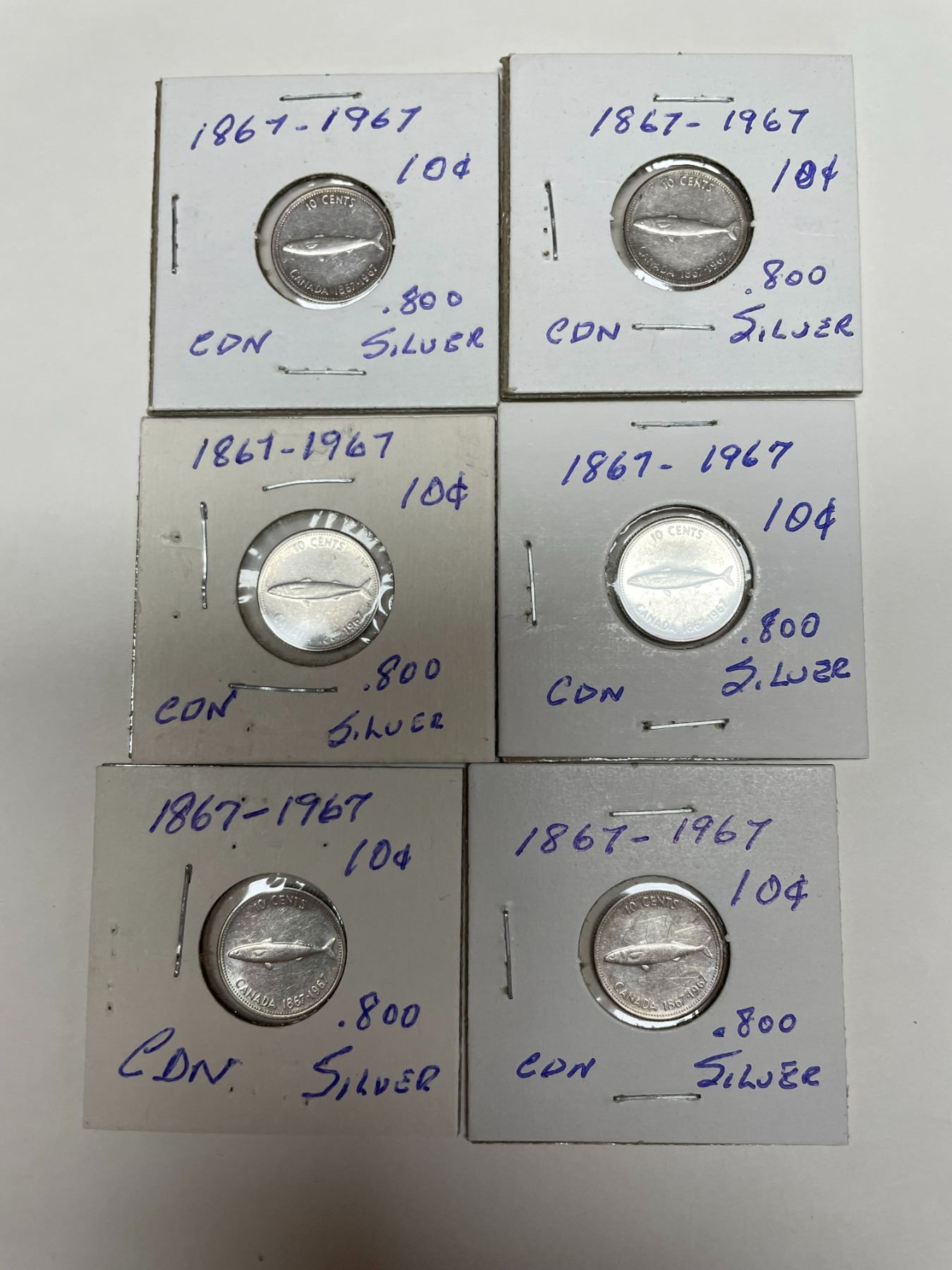 1867-1967 Canada Centennial Dimes 10 Cents, Mackerel Fish .800 Silver, 6 Coins