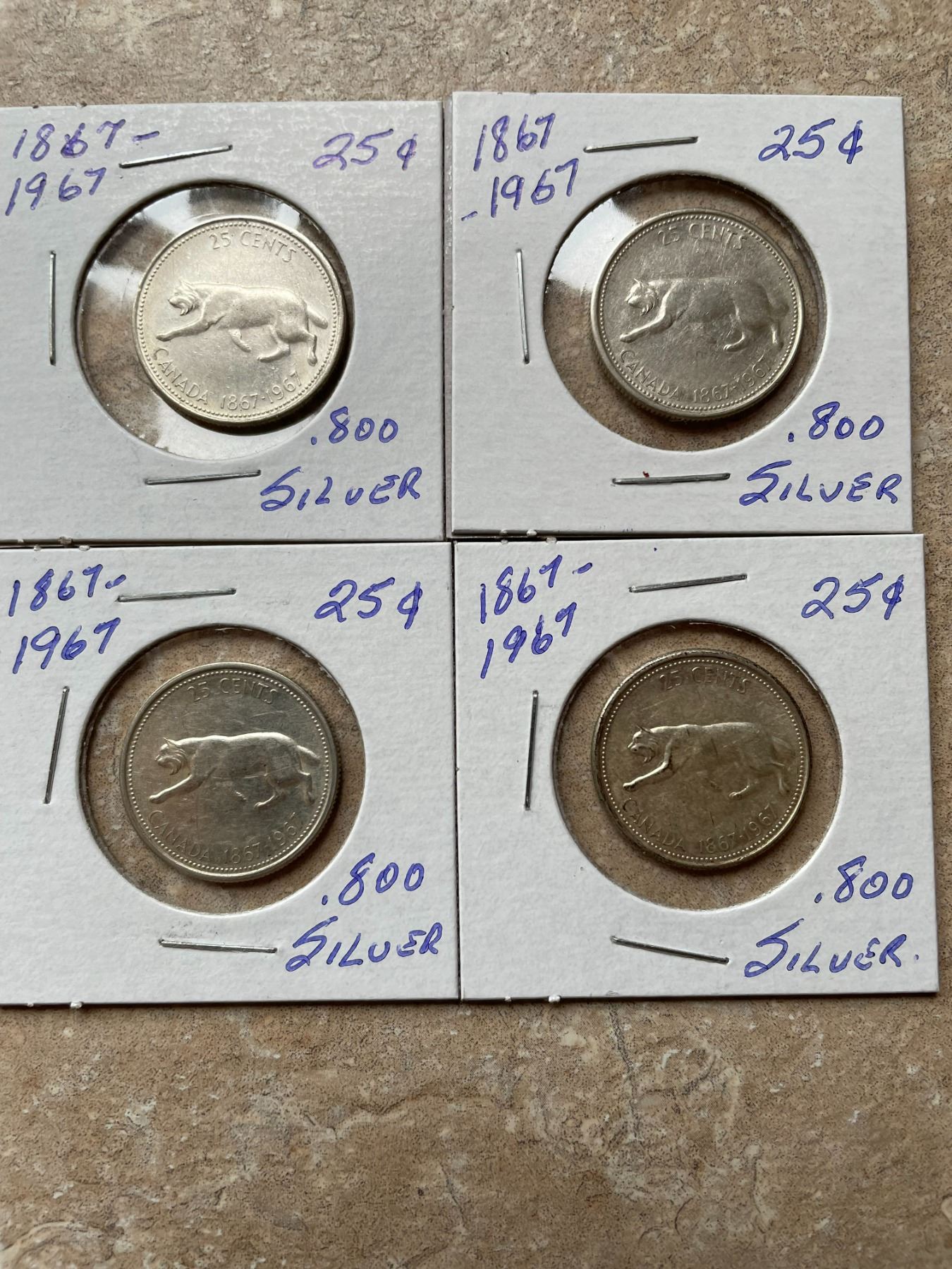 1867-1967 Canada Centennial Quarters 25 Cents, .800 Silver, 4 Coins