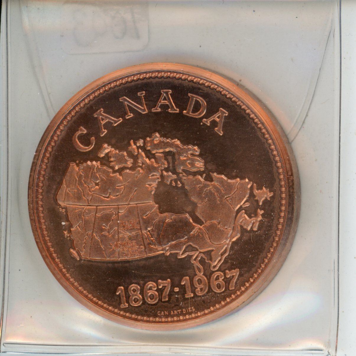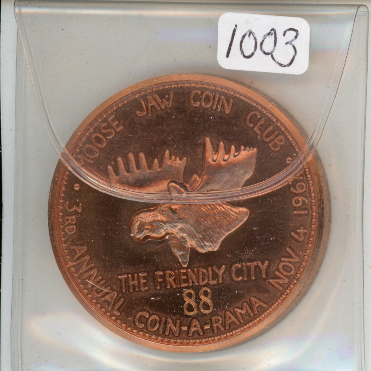 1867 – 1967 Moose Jaw Coin Club 3rd Annual Coin-A-Rama bronze medal. Engraved #88 for member number 88. BU.