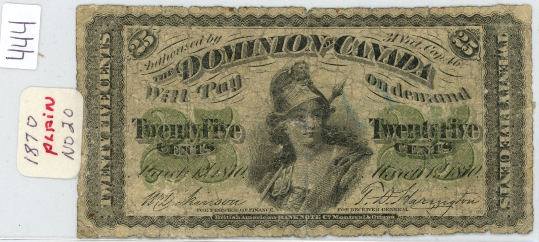 1870 Dominion of Canada twenty five cent shinplaster