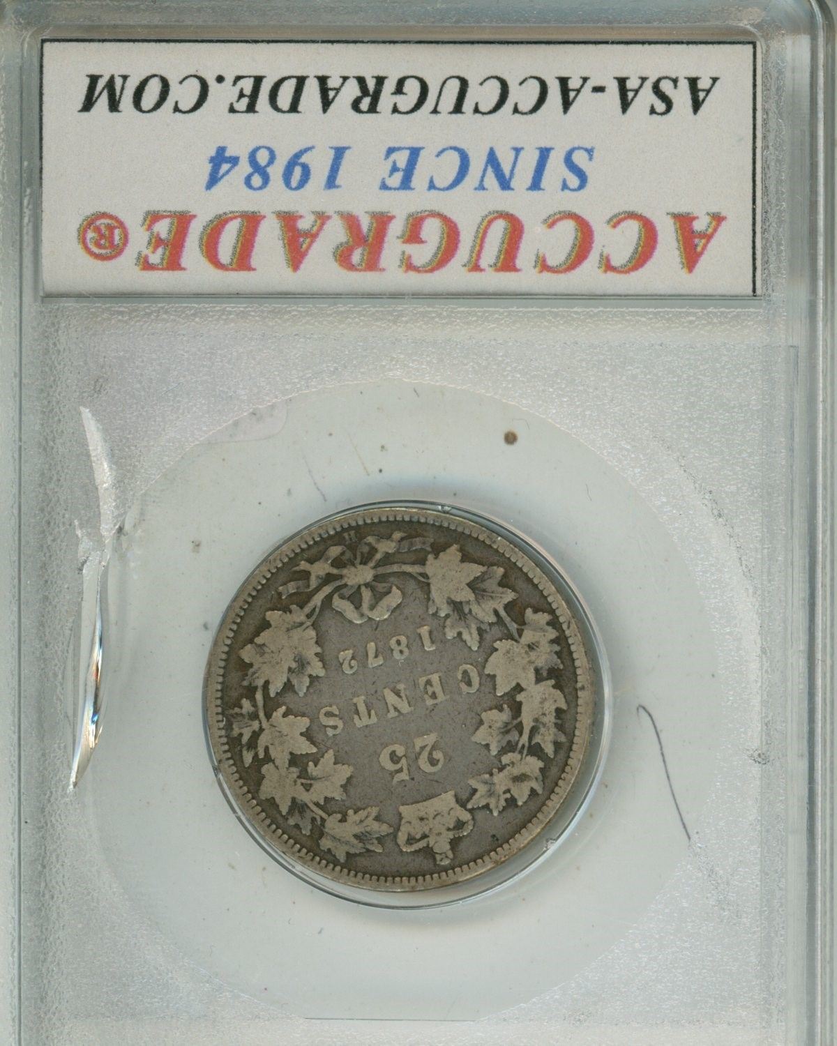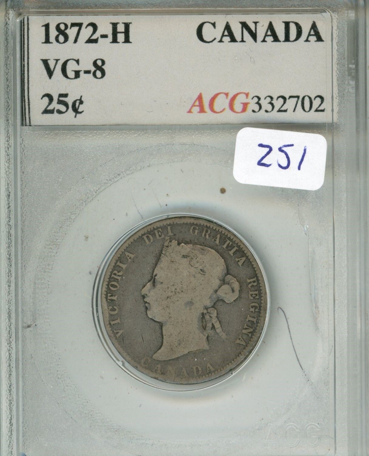 1872H Canadian Silver 25 Cents. ACG certified & graded VG-8.