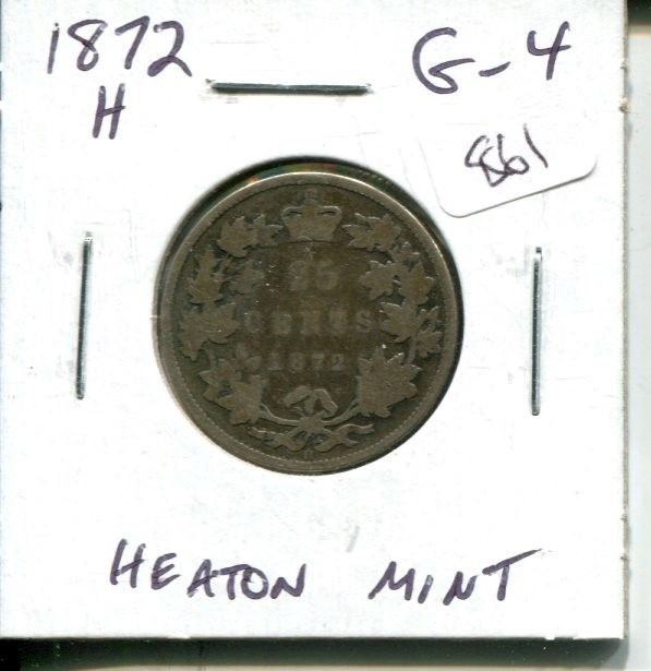 1872H Canadian Victorian Silver 25 Cents. Heaton Mint. G-4.