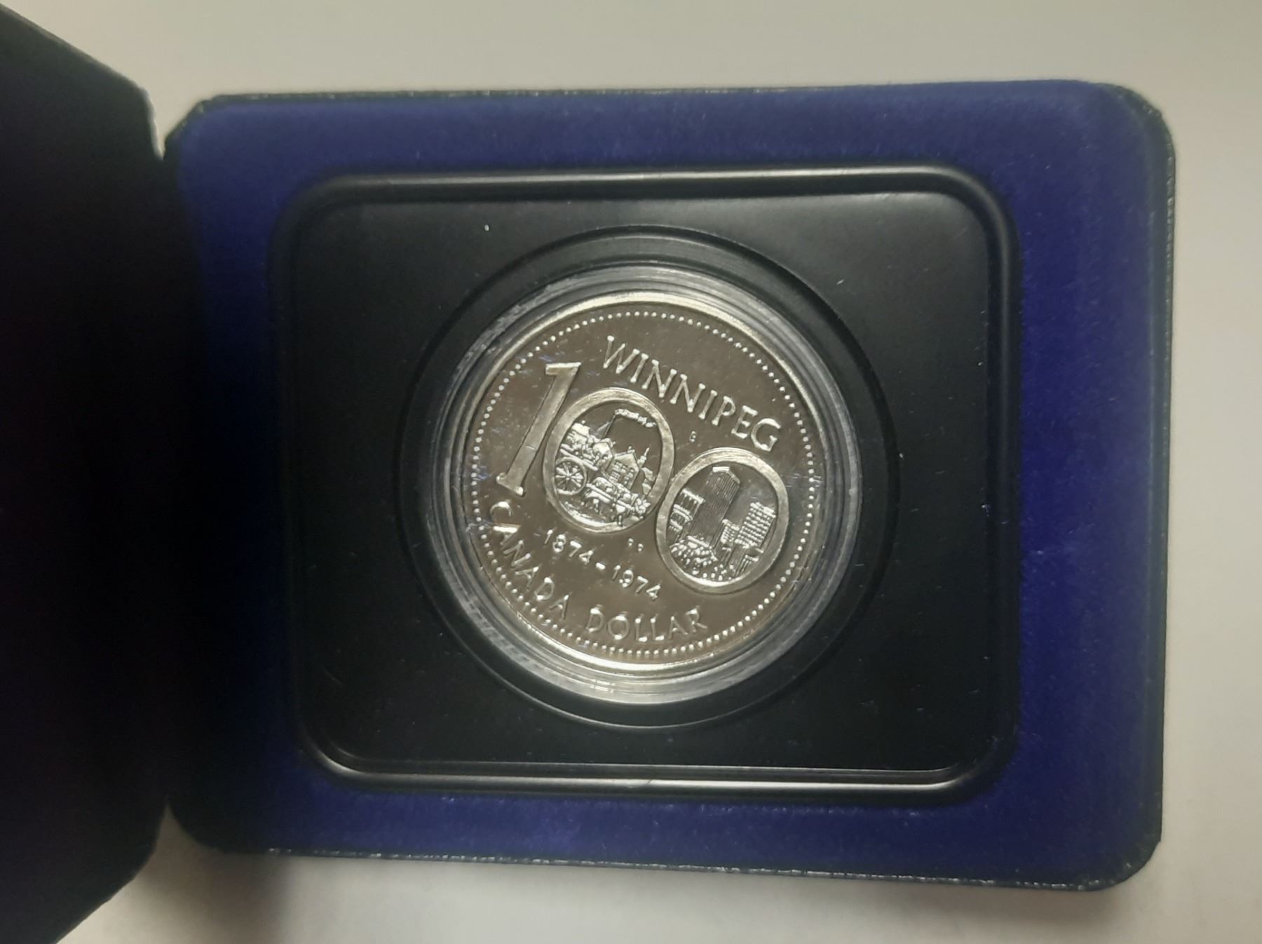 1874 – 1974 Winnipeg Centennial Nickel Dollar. Specimen. Housed in its original case.