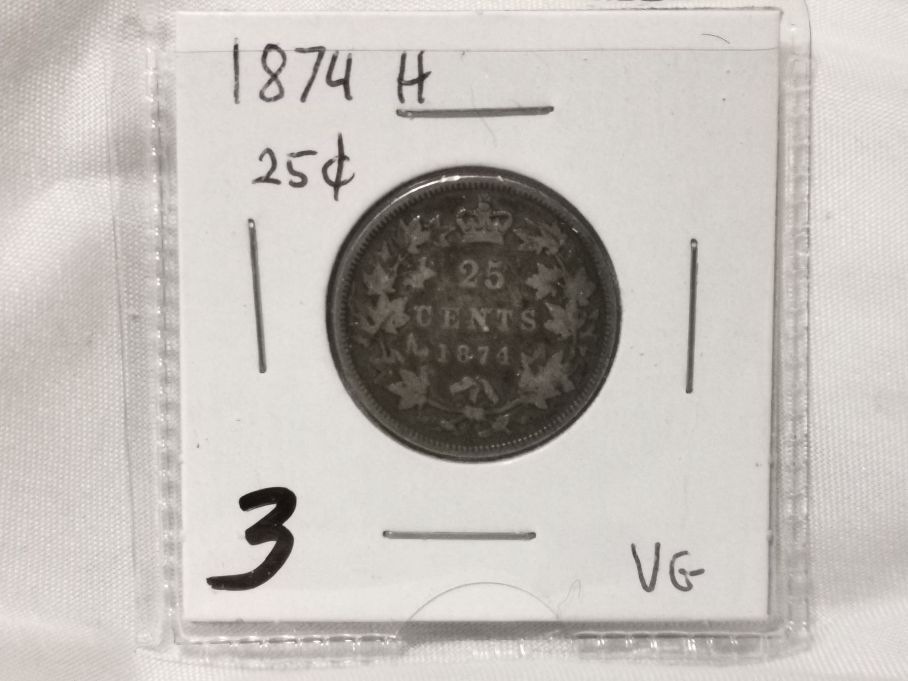 1874 H Canada Silver 25 Cent Coin