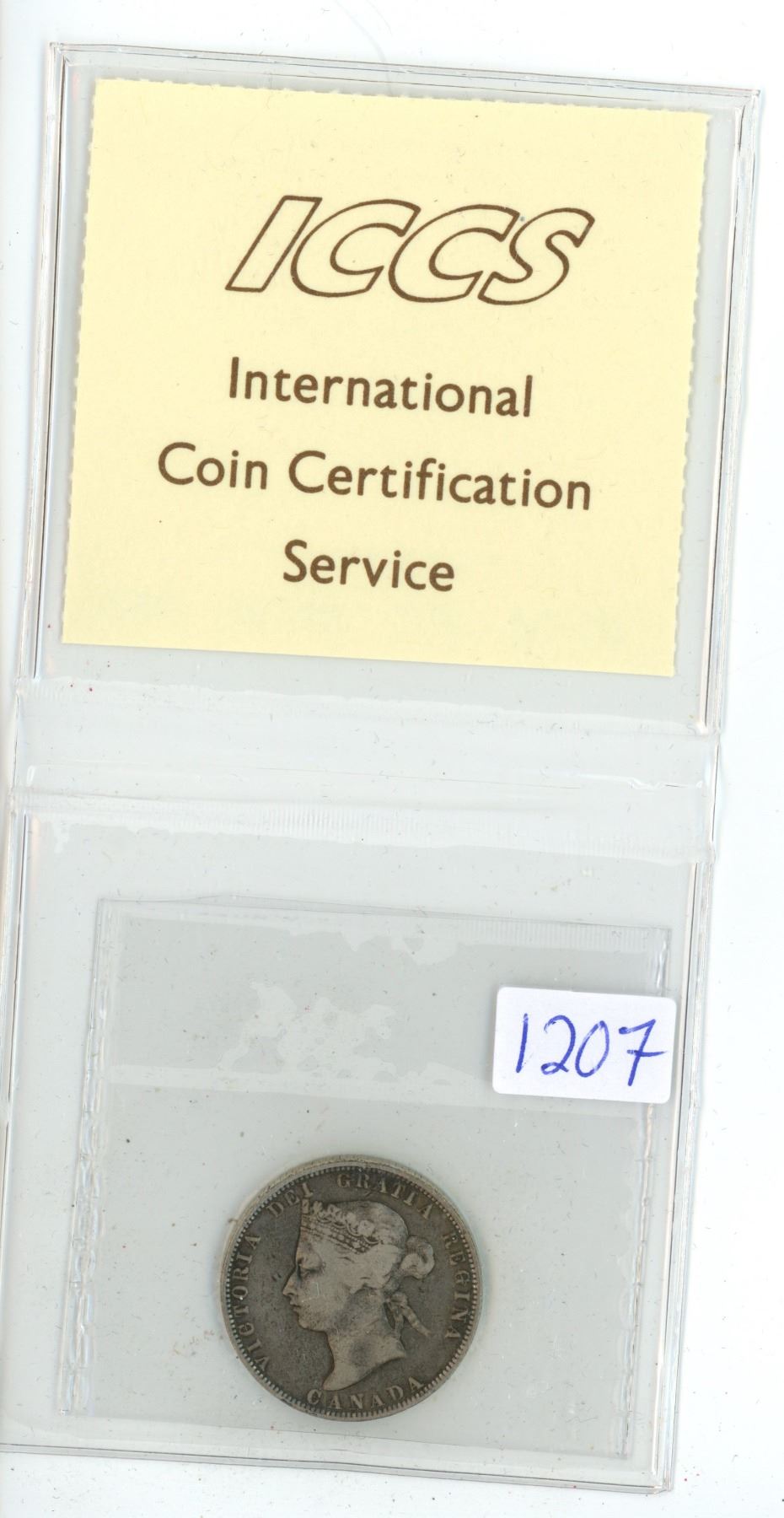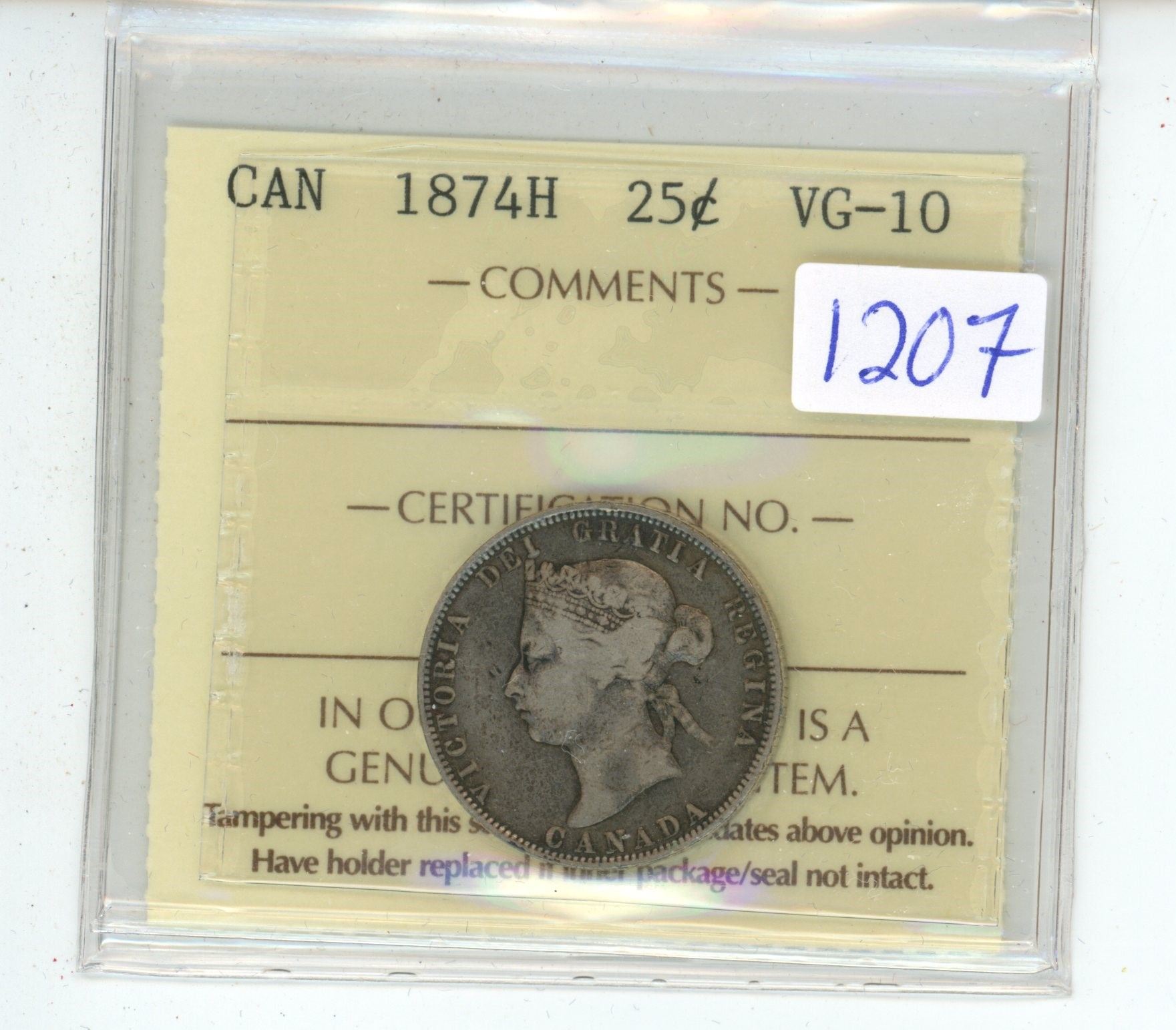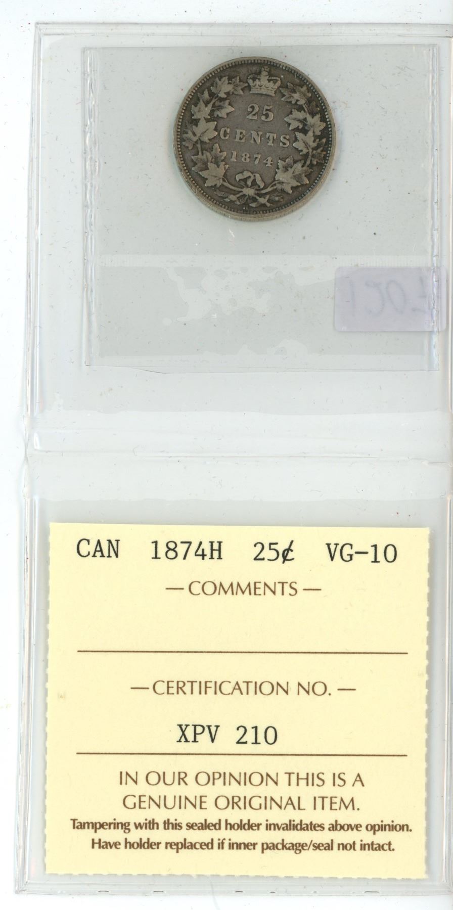 1874 H, ICCS Graded, Canadian 25 cent silver coin - VG10