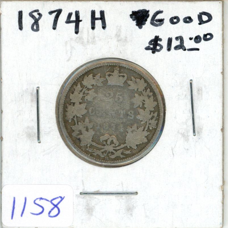 1874H Canadian Victorian Silver 25 Cents. Heaton Mint. Good-4.