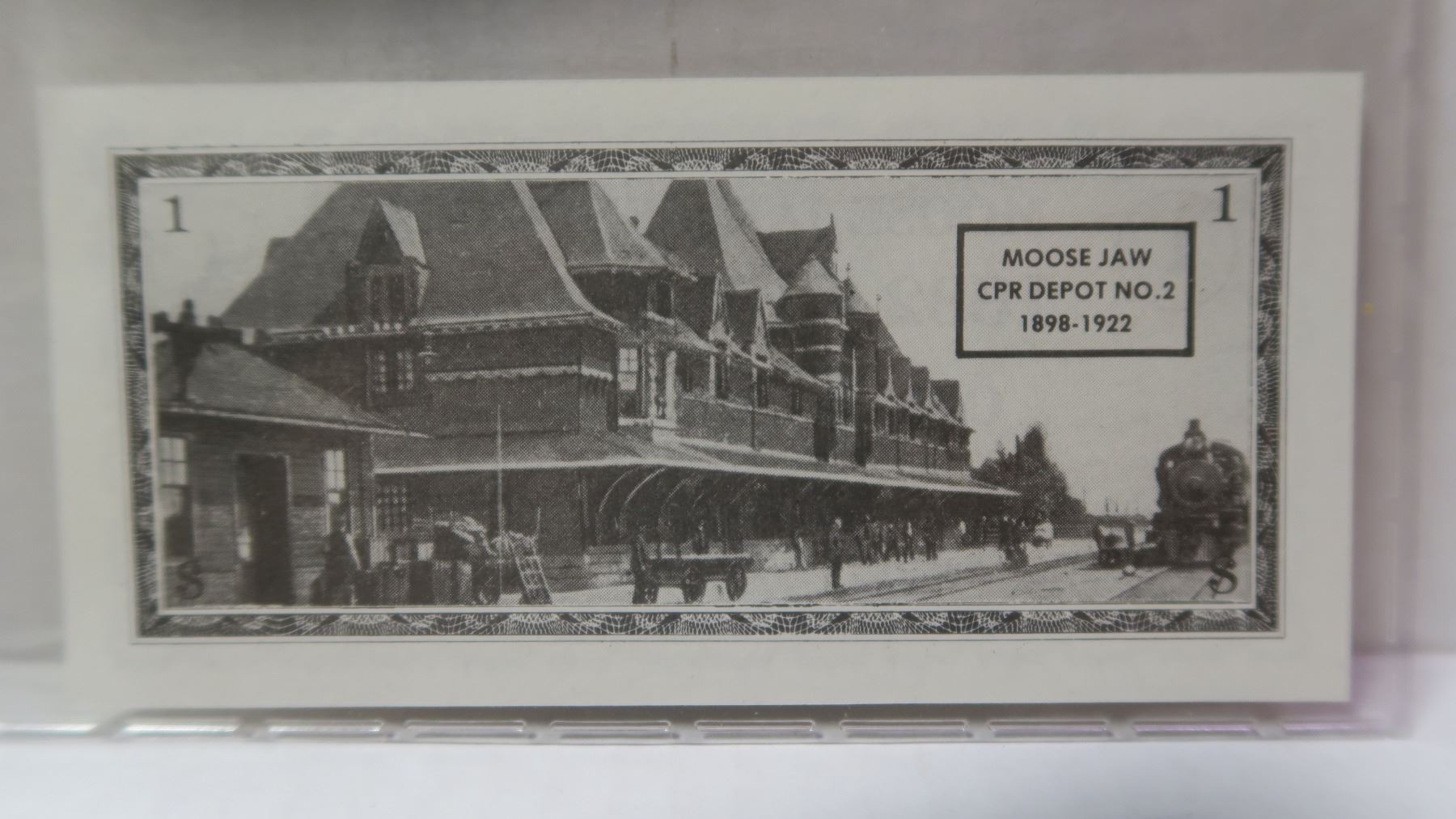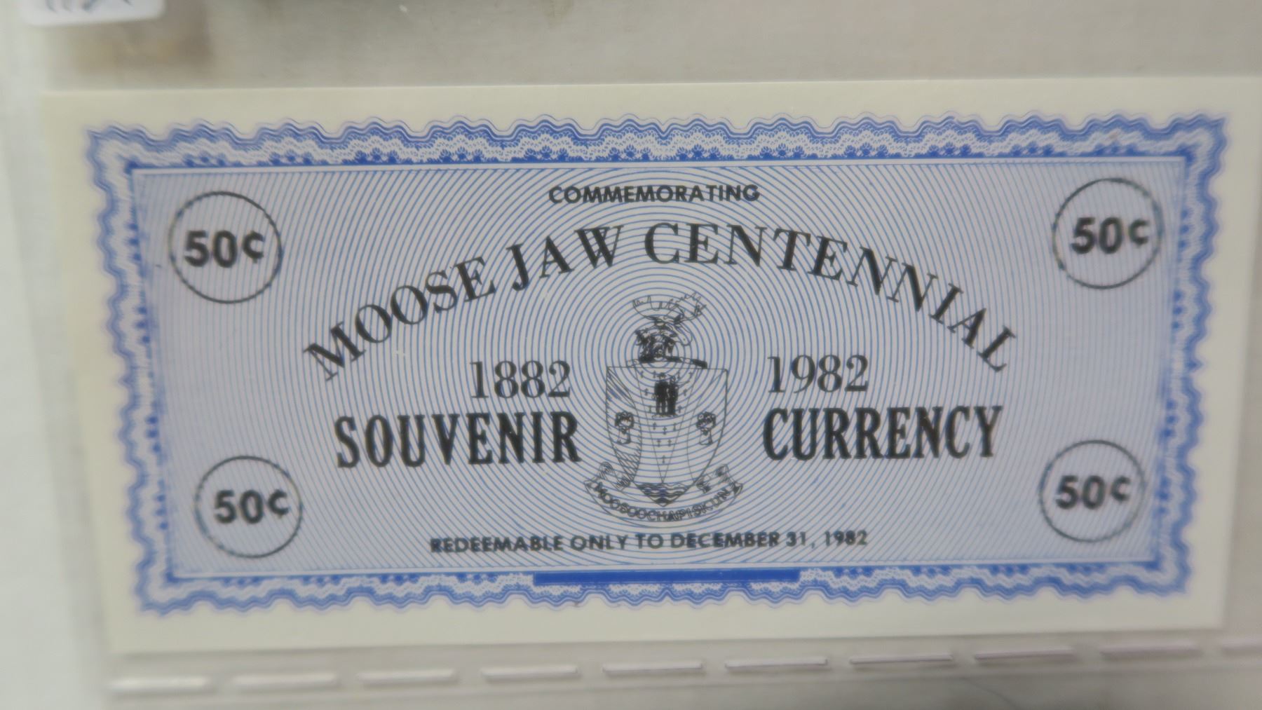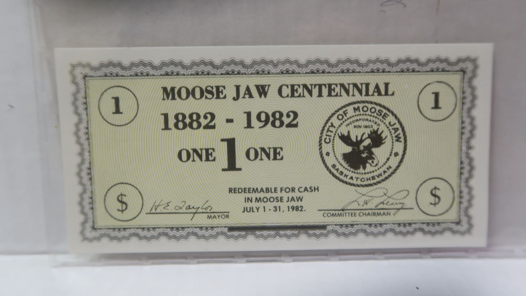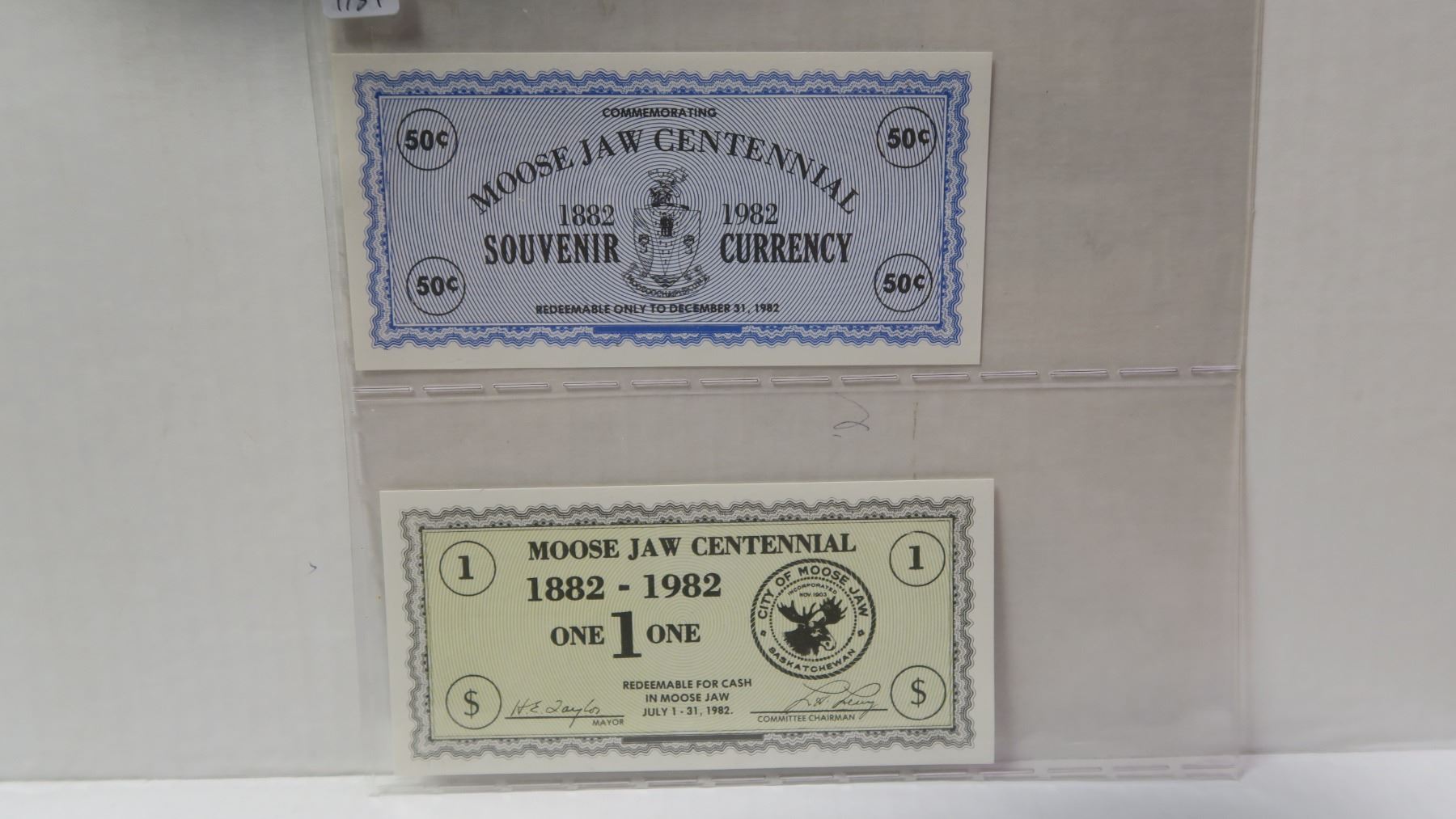 1882 – 1982 Moose Jaw Centennial Souvenir Currency Scrip. Includes 50 Cents & $1. One note is signed by Scoop Lewry. Uncirculated.