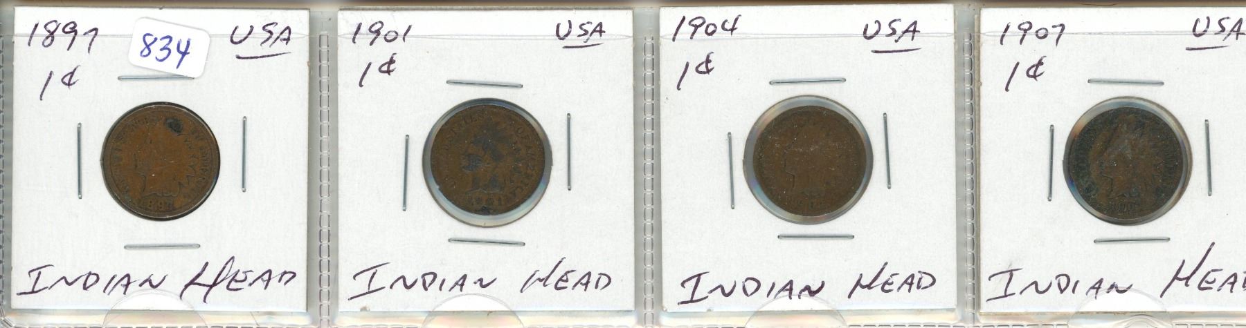 1887,1901,1904 and 1907 USA Indian Head Pennies