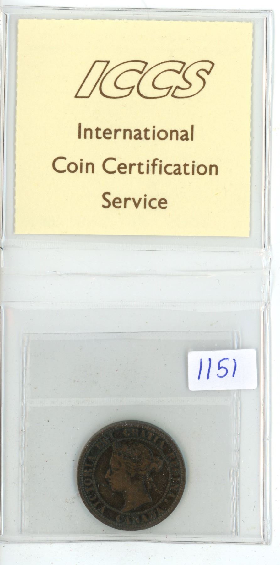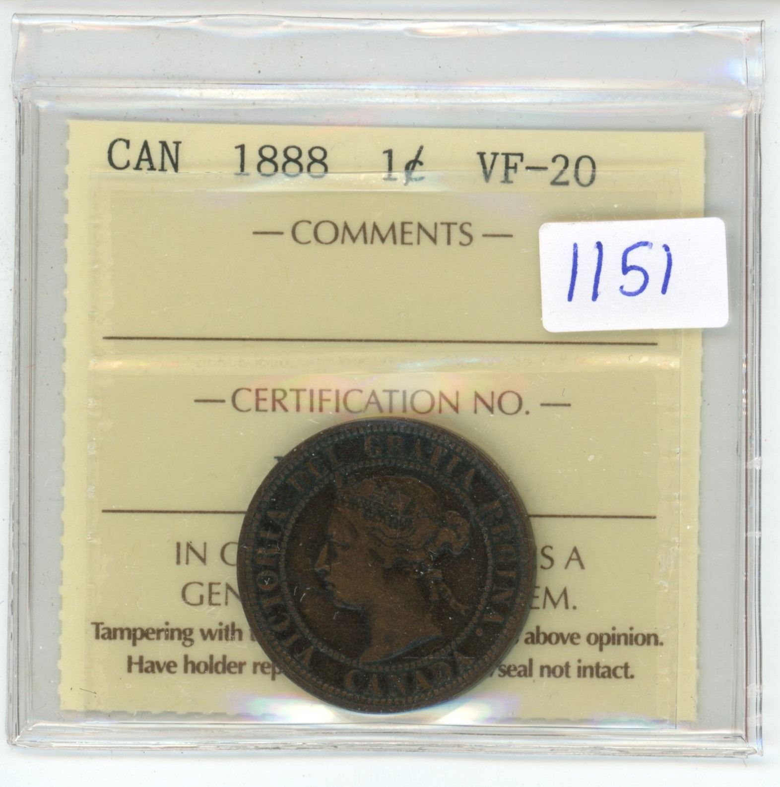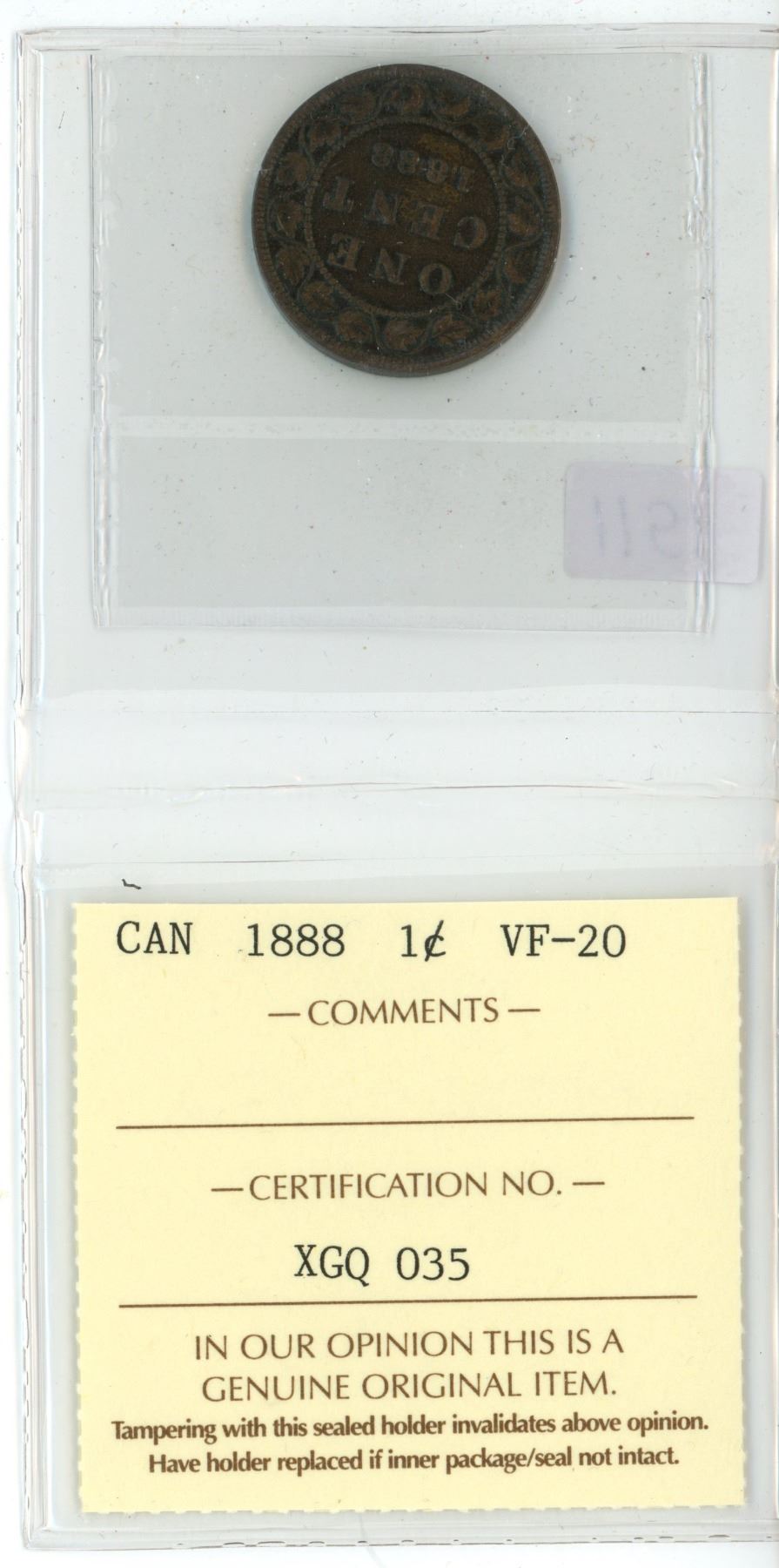 1888 ICCS Graded. Canadian large 1 cent penny coin - VF20