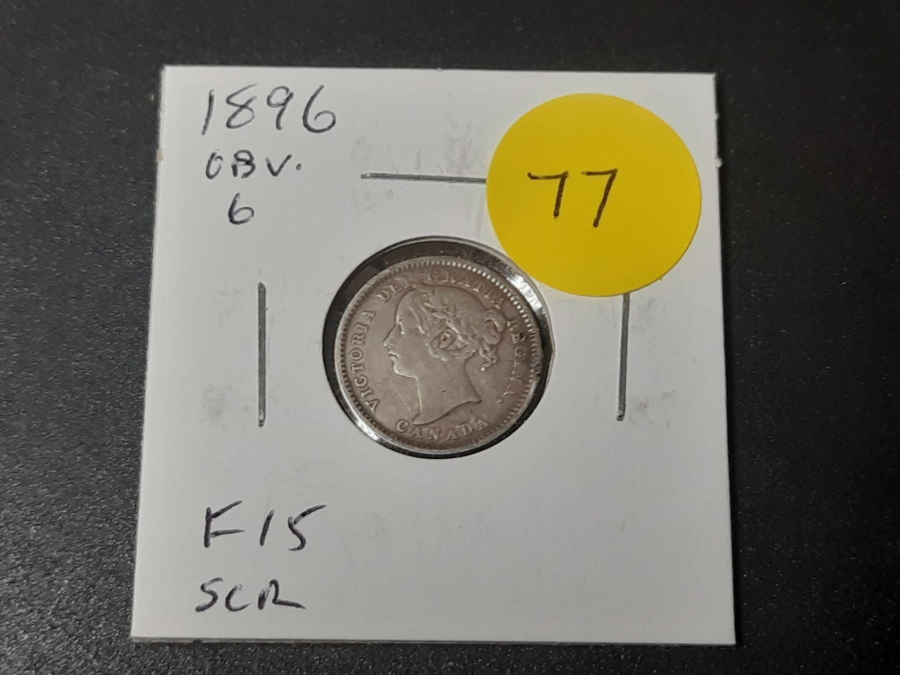 1896 Canadian Victorian Silver 10 Cents. Obverse 6. F15. Scratch.