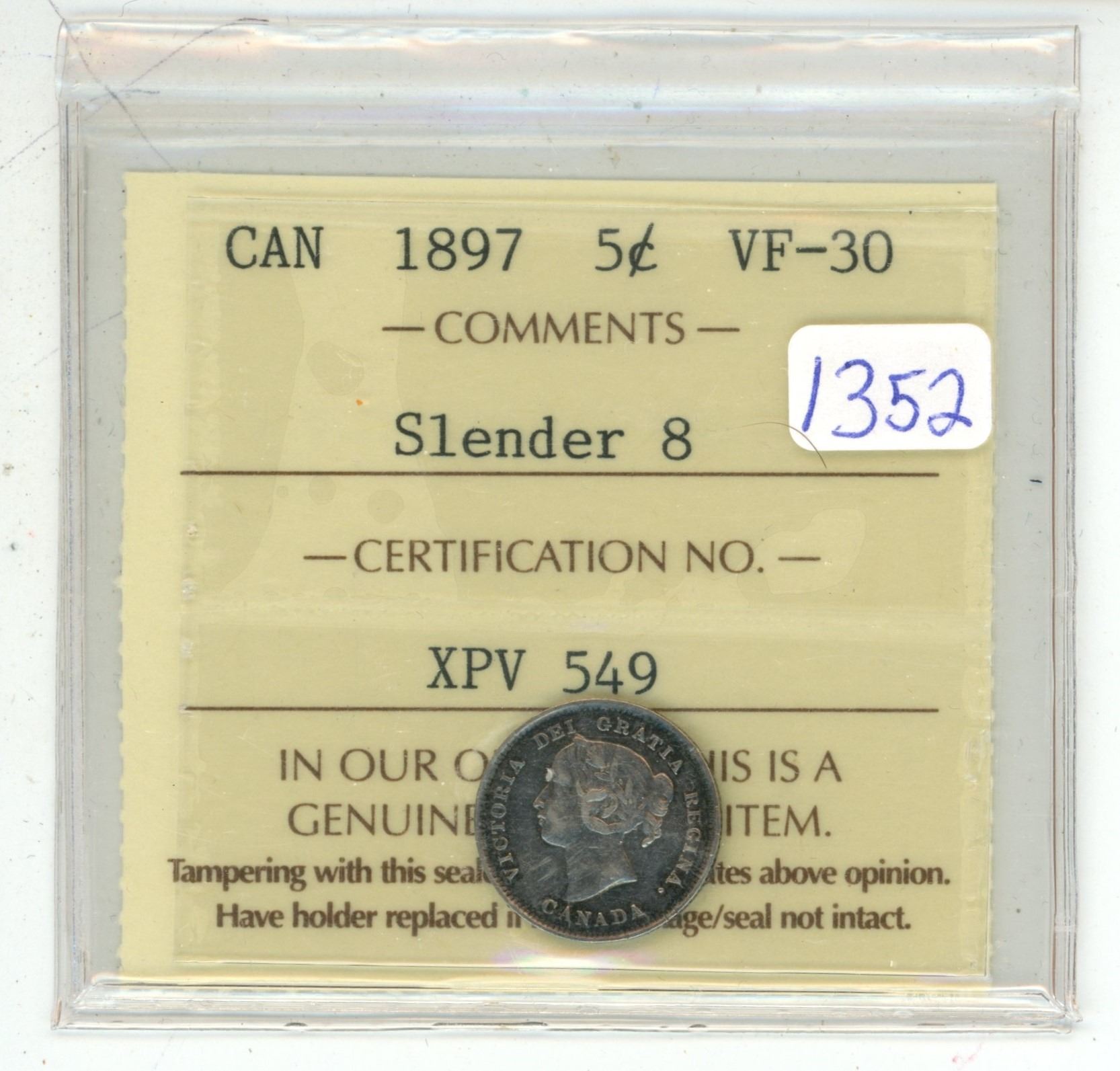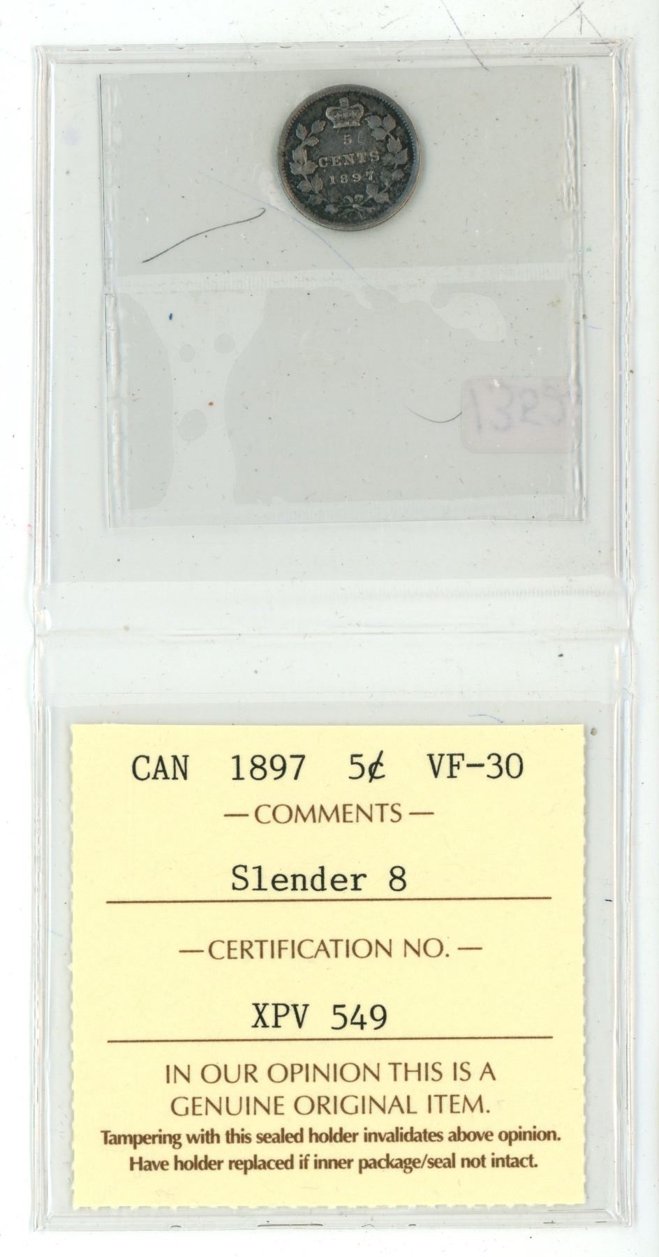 1897 ICCS graded, Canadian silver 5 cent coin - VF30
