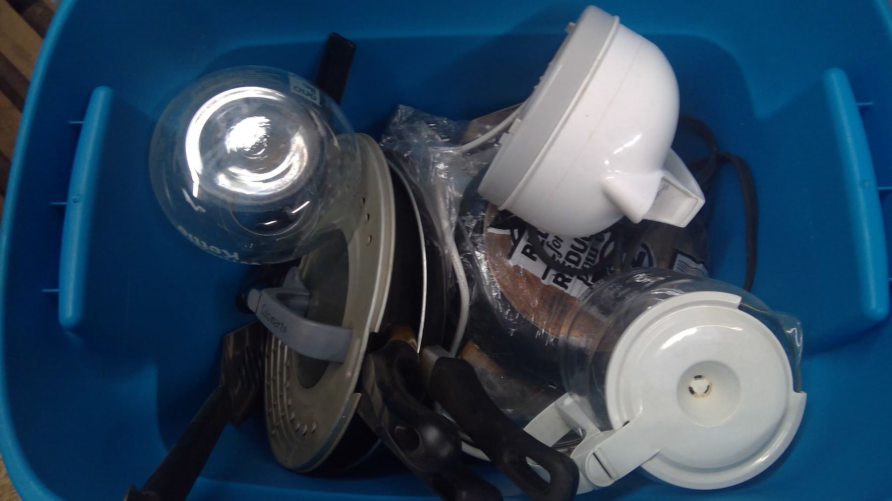 18gal tote, misc coffee pots,frying pans