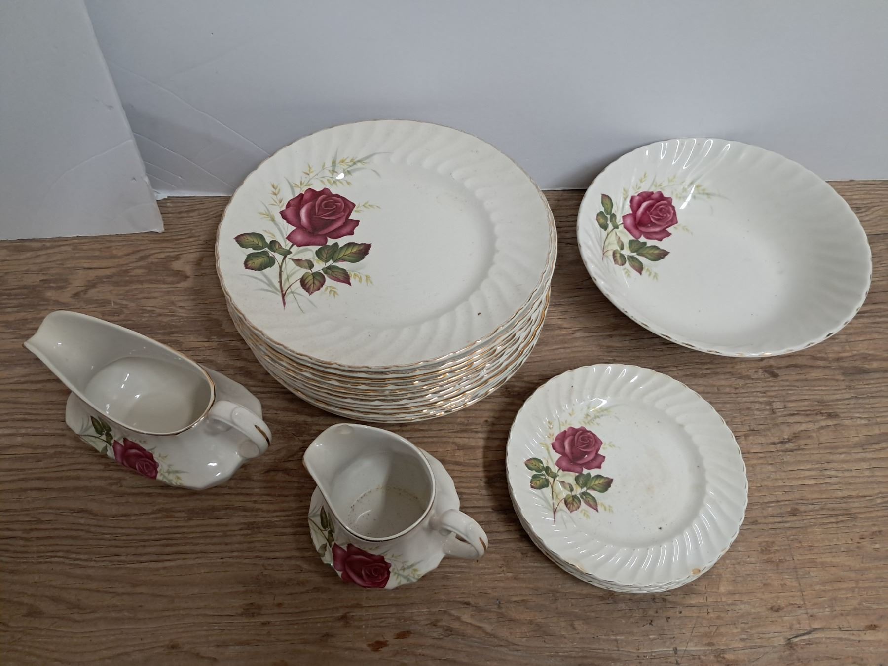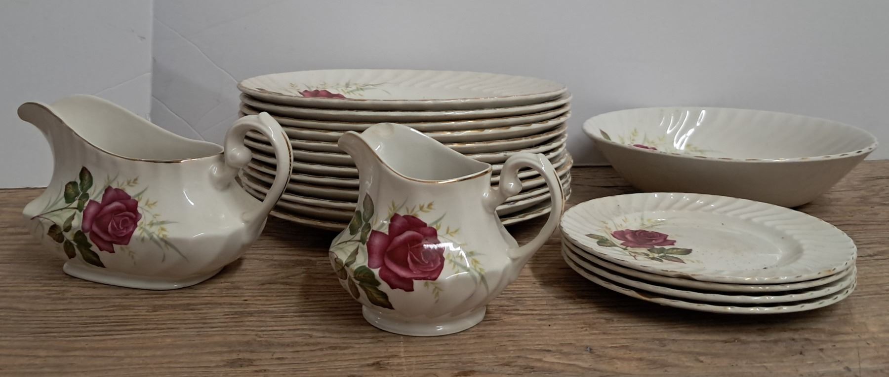 19 piece ridgeway ironstone anniversary rose gray creamer large plates (some chips)