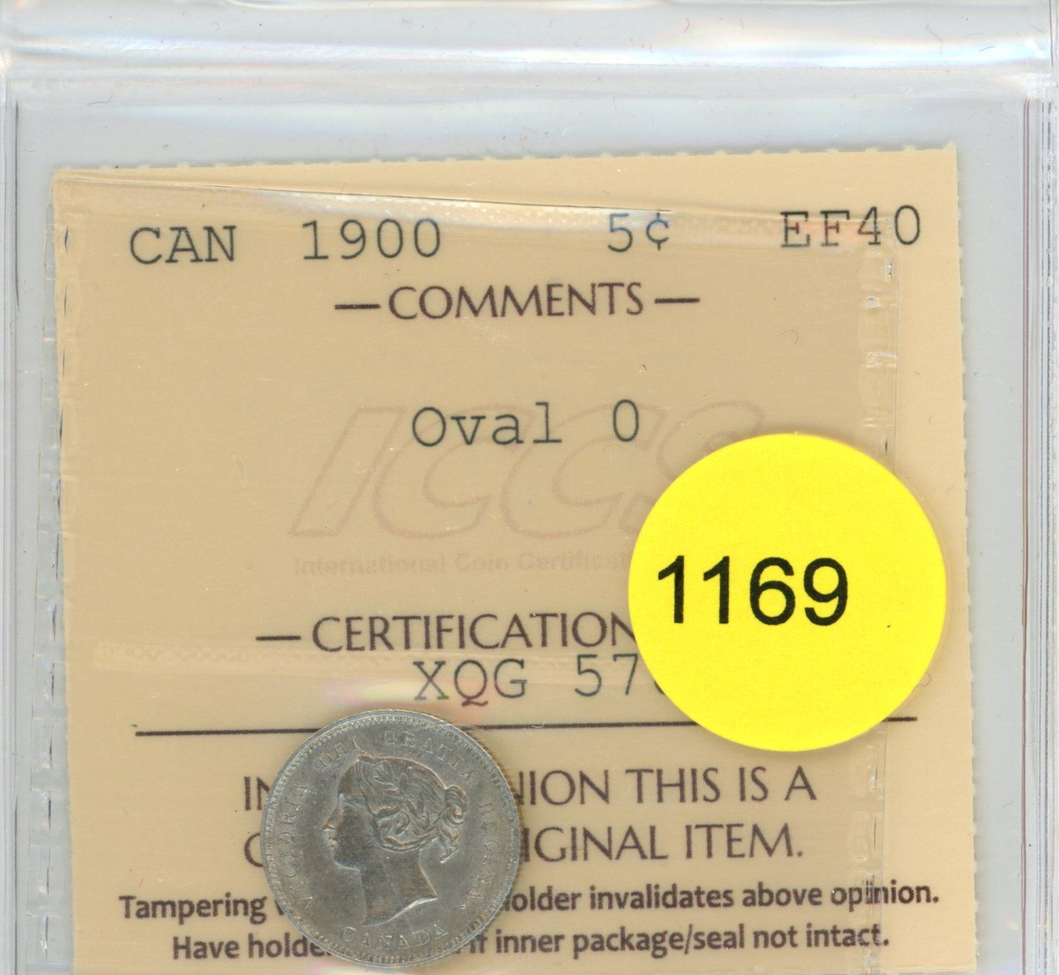1900 Oval 0 EF40 ICCS Graded Canadian Silver Five Cent Coin