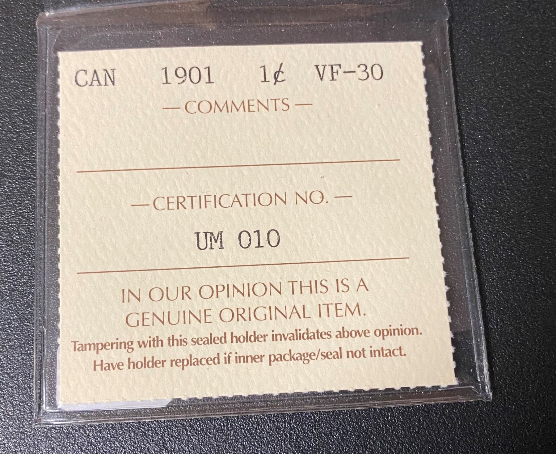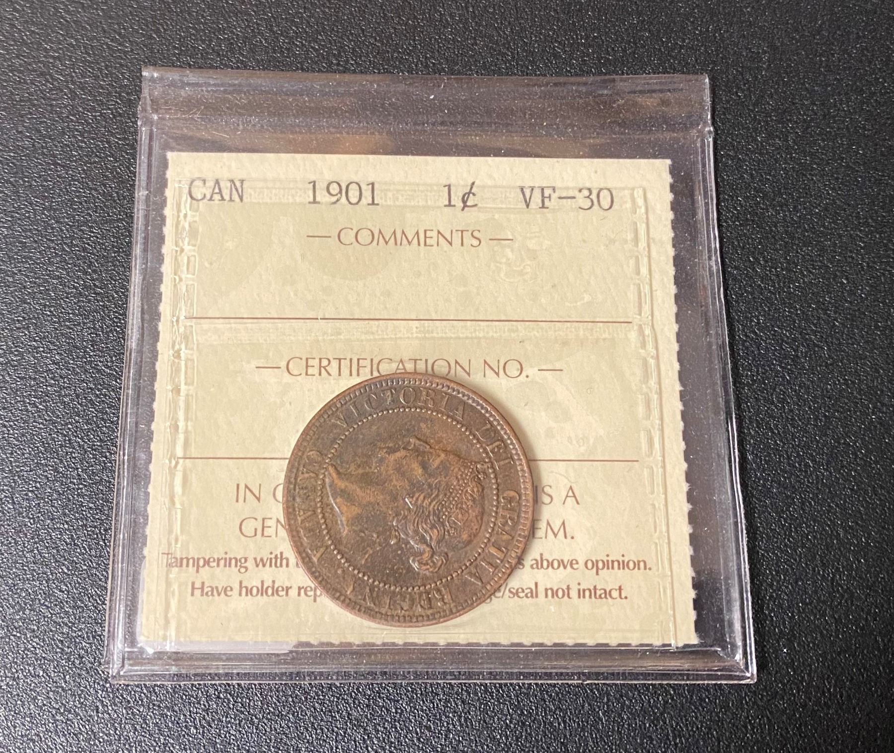 1901 Canadian One Cent Coin (VF-30) "ICCS"