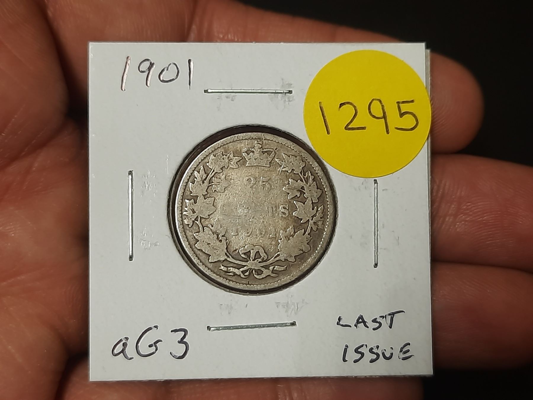 1901 Canadian Silver 25 Cents. Last issue of Queen Victoria. aG3 with readable date.