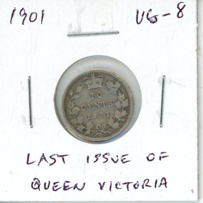 1901 Canadian Victorian Silver 10 Cents. The last silver 10 cents issued for Queen Victoria. VG-8.