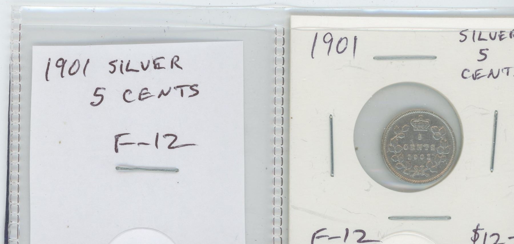 1901 VICTORIAN SILVER 5 CENTS. THE LAST YEAR OF VICTORIA’S REIGN. F-12. NICE FOR THE GRADE.