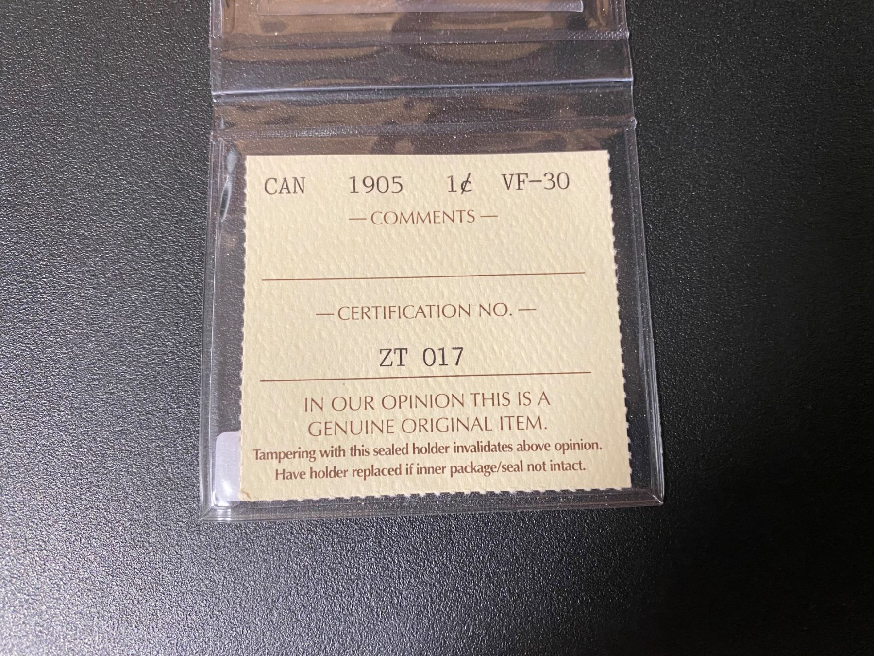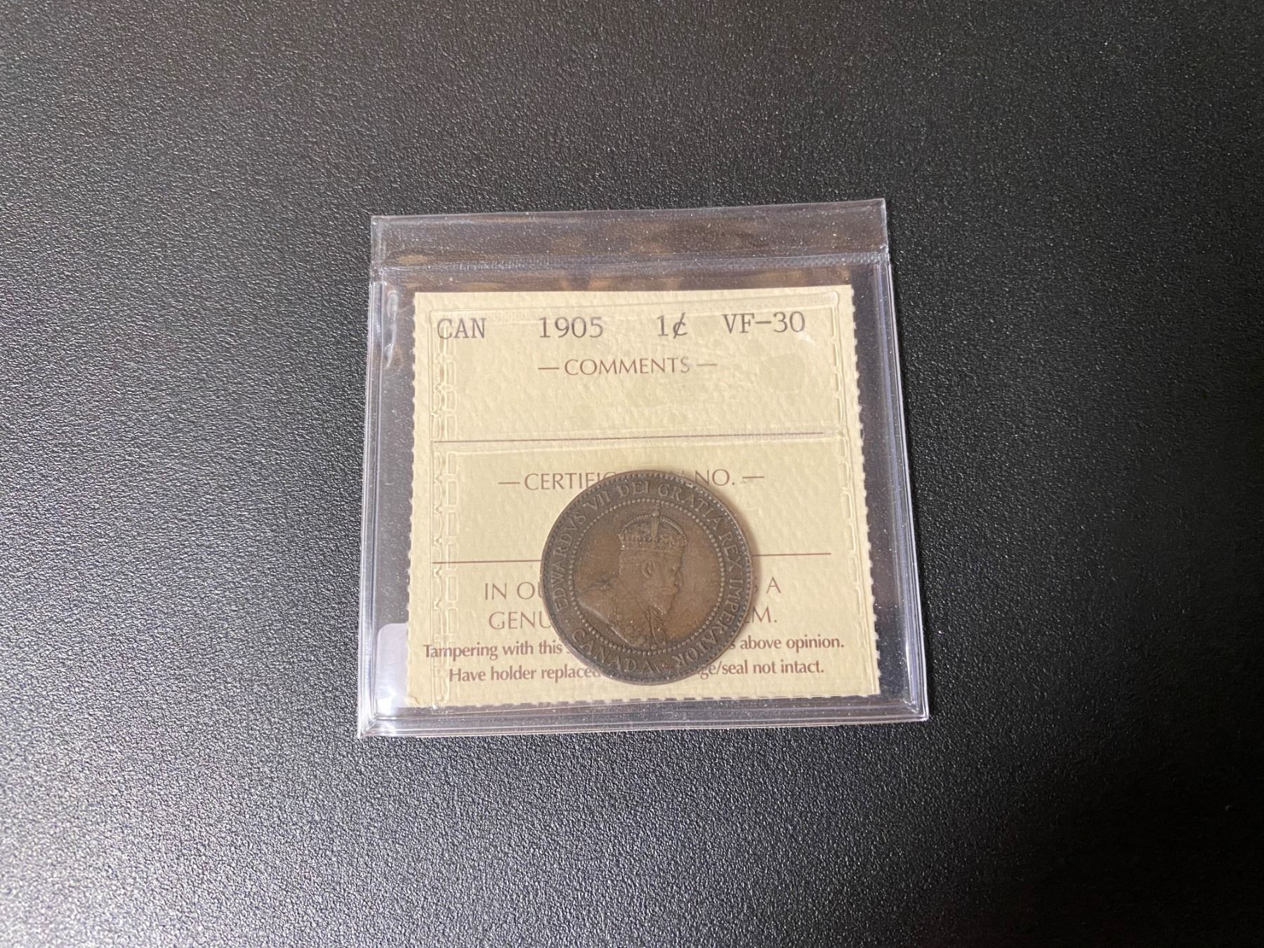 1905 Canadian One Cent Coin (VF-30) "ICCS"