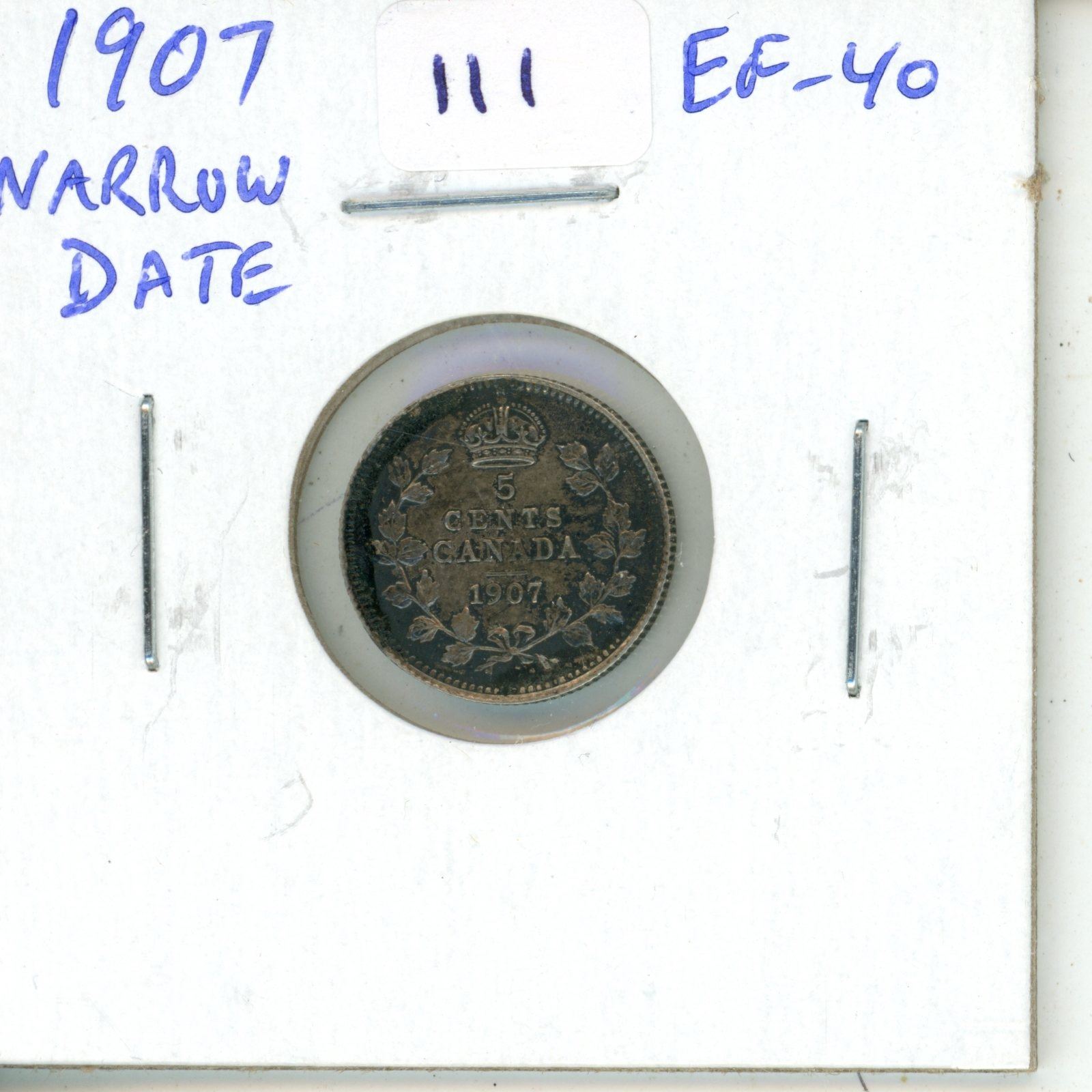 1907 Narrow Date Canadian Silver 5 Cents. King Edward VII. EF-40.