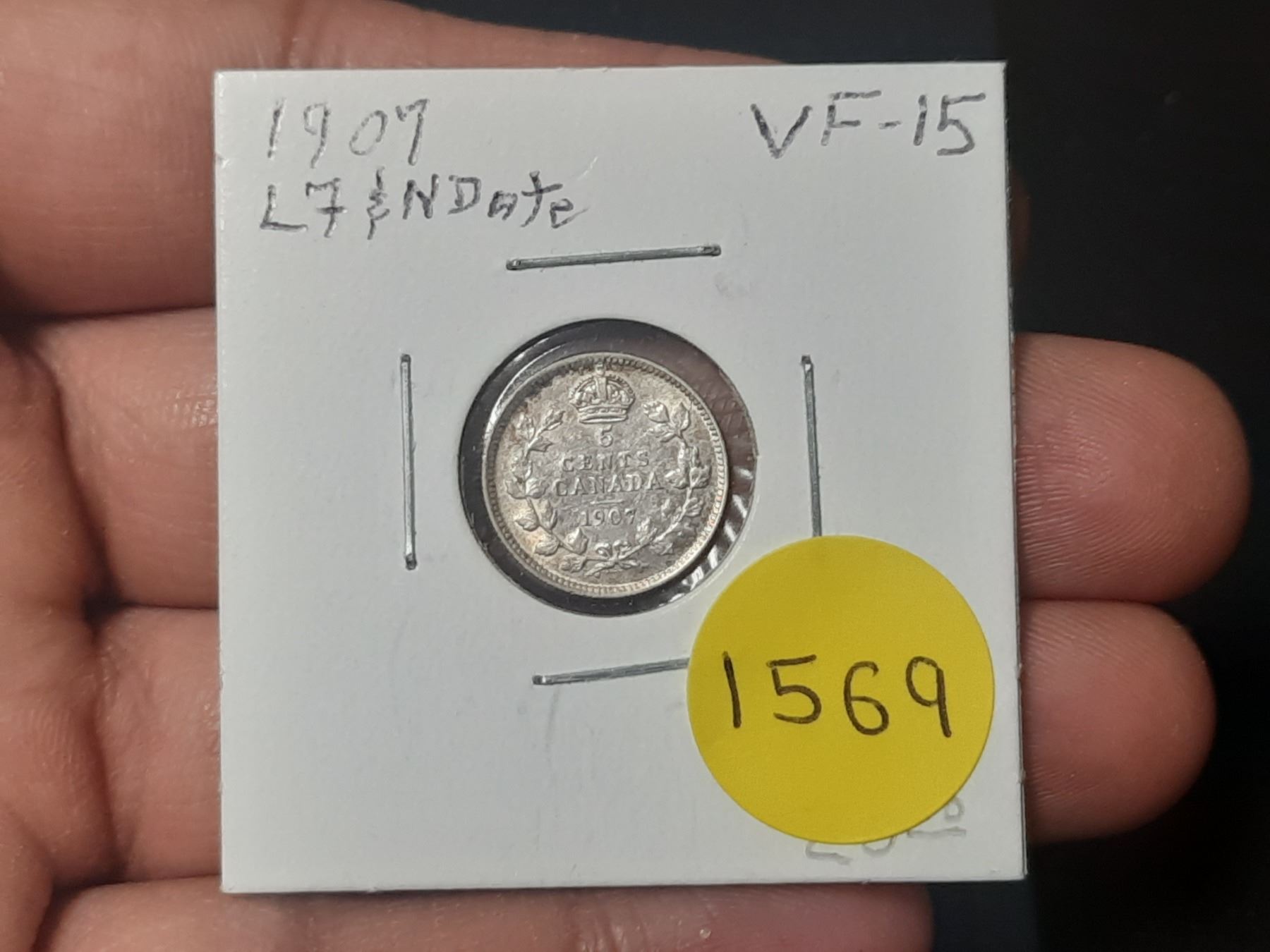 1907 VF-15 Canadian Silver Small Five Cents - L7 & N Date