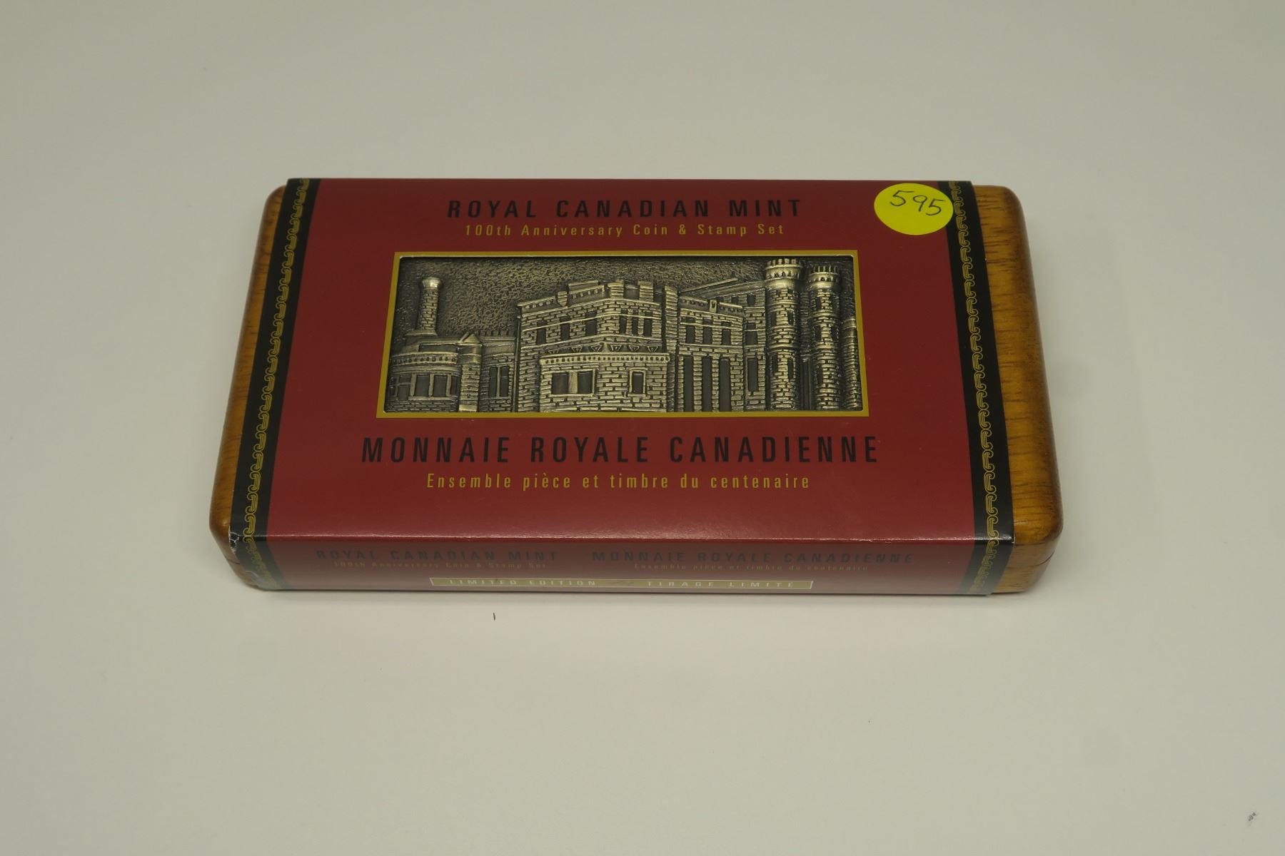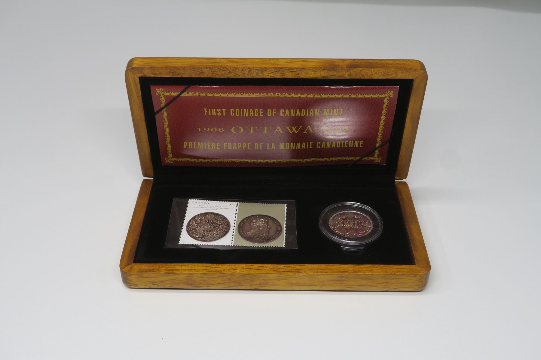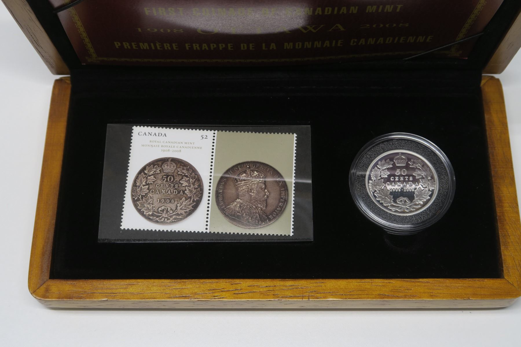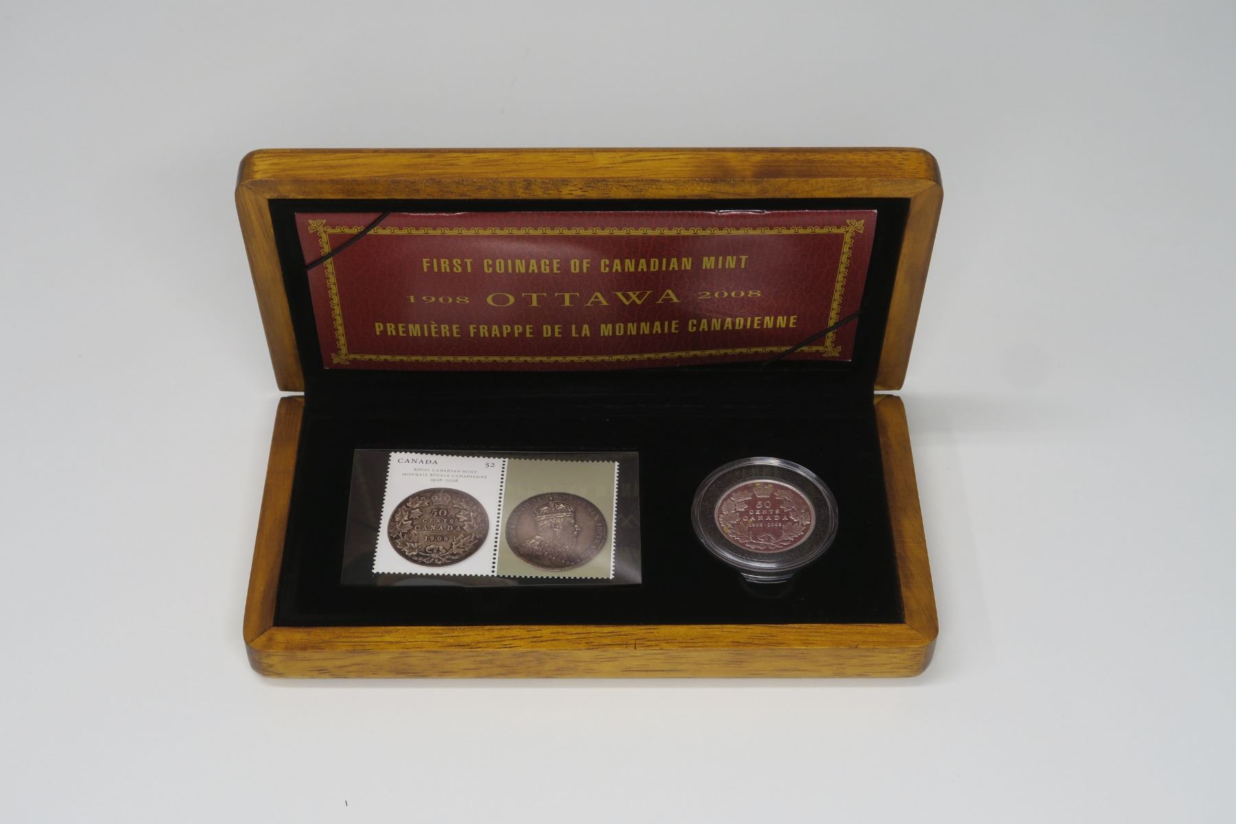 1908 – 2008 100th Anniversary Coin & Stamp Set. Includes 2008 Sterling Silver 50 Cents that depicts the first Silver 50 Cents minted in Canada. Includes 2 Stamps that depict both sides of the coin. Proof with Ultra Heavy Cameo. In wooden box of issue.