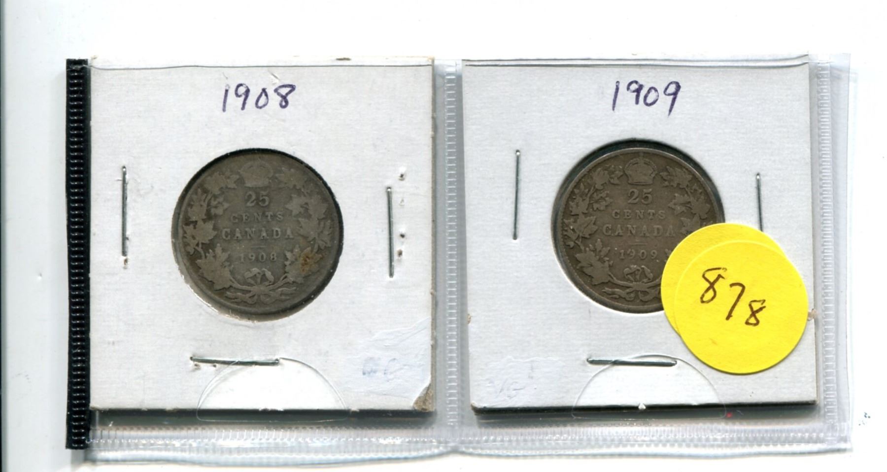 1908 and 1909 Canada Silver Twenty-Five Cent Coins