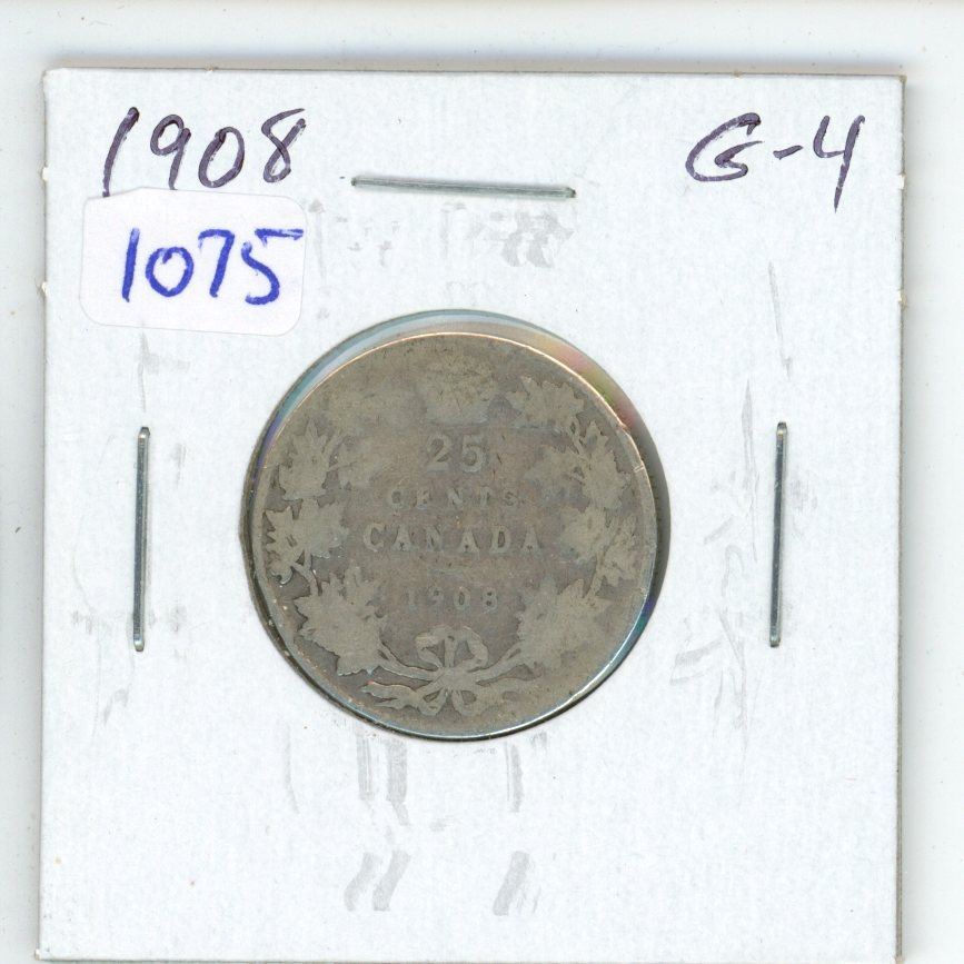 1908 Canadian Silver 25 Cents. The first 25 Cents minted in Canada. G-4.